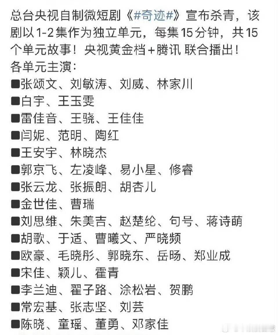 内娱短剧上星央一的含金量 内娱短剧支棱起来了!《奇迹》直接冲上央一,戏骨和总台的含金量直接拉满!胡歌张颂文稳扎稳打,于适王安宇活力跟上,这下谁还敢说短剧没排面!总台首部原创精品短剧集奇迹