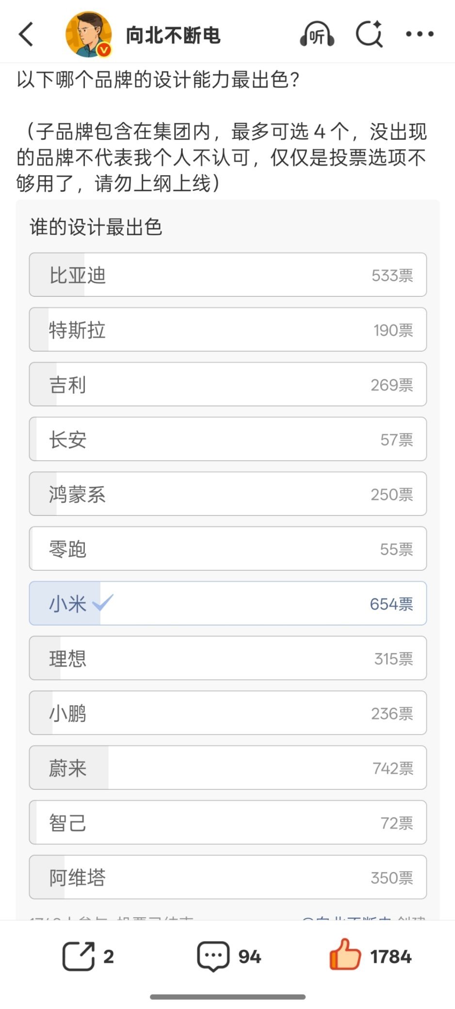 3yc核心koc发起的投票问谁家设计强,蔚来小米反而排一二,请问原因∶1. koc吃百家饭不寒碜2. 心有灵犀的实力恐怖如斯3. 迪粉中出了坏人4. 大象黑了投票箱5. 电机太多导致设计不突出抽象汽车商业评论赢学研究