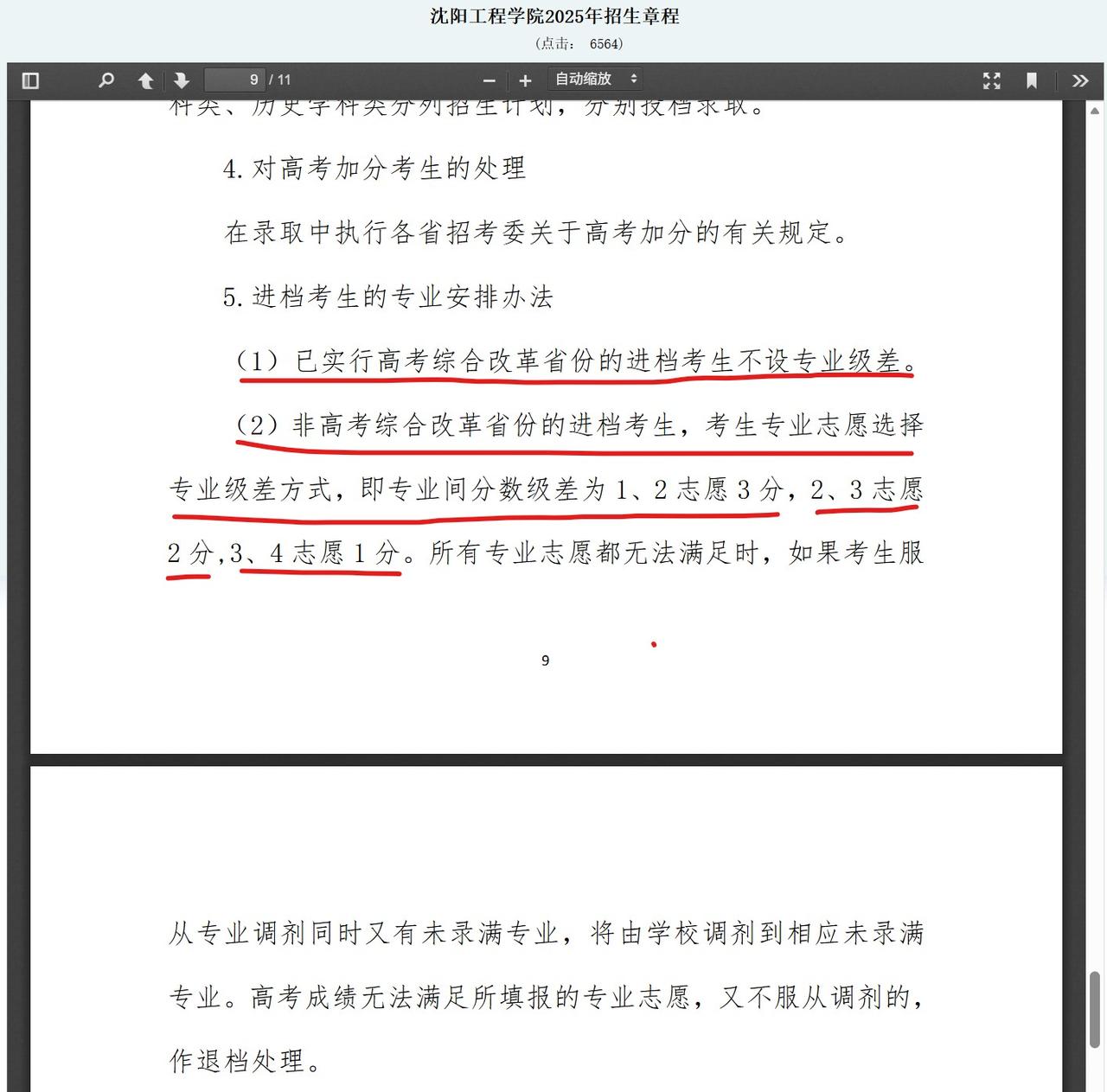 2025年,还有“半所”院校使用专业级差,实行3-2-1。 近些年来,安排专业时使用专业级差的院校越来越少了,他们几乎都转向了“分数优先”。这对于考生来讲是一个极大的利好消息,可避免因专业排序不合理,而被调剂或退档。 专业级差是院校分配专业的一种方法,实行专业级差的院校,会先看进档考生的第一专业志愿。如果进档考生在第一专业志愿可以被录取,那么专业级差对这位考生就没有什么影响;如果考生分数达不到第一专业志愿的录取线,就会在原有进档分数上,减去级差分,再与第二专业志愿匹配;如果考生减去级差分的分数,达到了第二专业志愿录取线,就录取,否则,就会再减去级差分,再与后面的专业志愿匹配。如此,考生的进档分越减越少,录取的可能越来越低,最后很可能就是调剂或退档。 在浏览曾使用过专业级差的所有院校2025年招生章程后,发现:沈阳工程学院是最后一所使用专业级差的院校。之所以称之为“半所”,是因为沈阳工程学院的专业级差仅在非高考综合改革省份使用;2025年非高考综合改革省份仅有新疆、西藏,也就是说沈阳工程学院仅在上述两个区使用专业级差。相信在2026年,专业级差将成为历史。 沈阳工程学院是一所以能源电力为特色的应用型本科院校,因其较高的就业率受考生的追捧,上世纪曾被称为“专科中的小清华”。