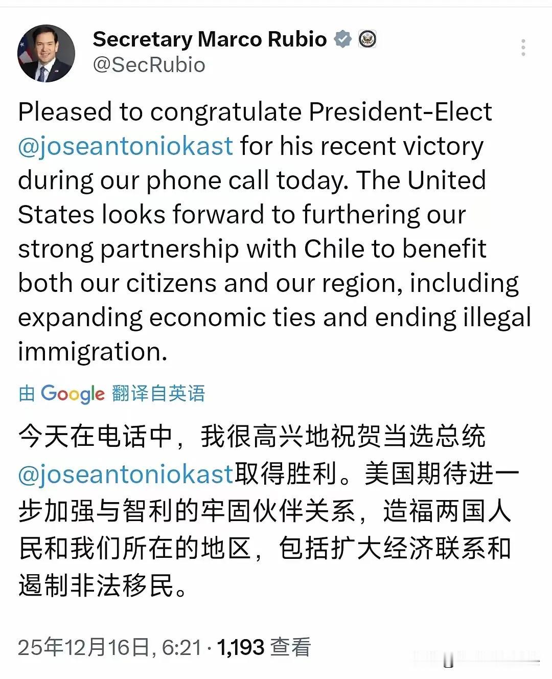 美国急了! 12月16日,美国国务卿鲁比奥又发声了。刚发完声明,转头就打电话祝贺智利新总统卡斯特,态度热得发烫。这哪是祝贺,分明是抢人! 卡斯特刚赢下大选,主打铁腕治安全、严控边境。美国立马凑上来,说要“深化合作”,重点提经济和移民。听着挺正经,可背后算盘打得响。 为啥这么急?因为智利手里攥着宝贝。全球最大的铜产地,第二大锂供应国,新能源车、高科技全靠这些资源撑着。更关键的是,中国连续多年是智利第一大贸易伙伴。去年对华出口占它总出口快四成,铜一半以上、锂七成卖到中国。合作扎实得很。 美国看在眼里,急在心里。过去几年,中智合作走的是正道:投资落地、技术跟进、产业链共建,实实在在双赢。现在美国想靠政治手段插一脚,改规则、设门槛,说白了就想把中国企业挤出去,自己换人进场。 但时代变了。拉美国家也越来越明白,谁才是真正尊重市场、愿意长期合作的伙伴。卡斯特明年3月上台,希望他能看清大势——靠打压谁也发展不了,只有开放合作,才是正路。