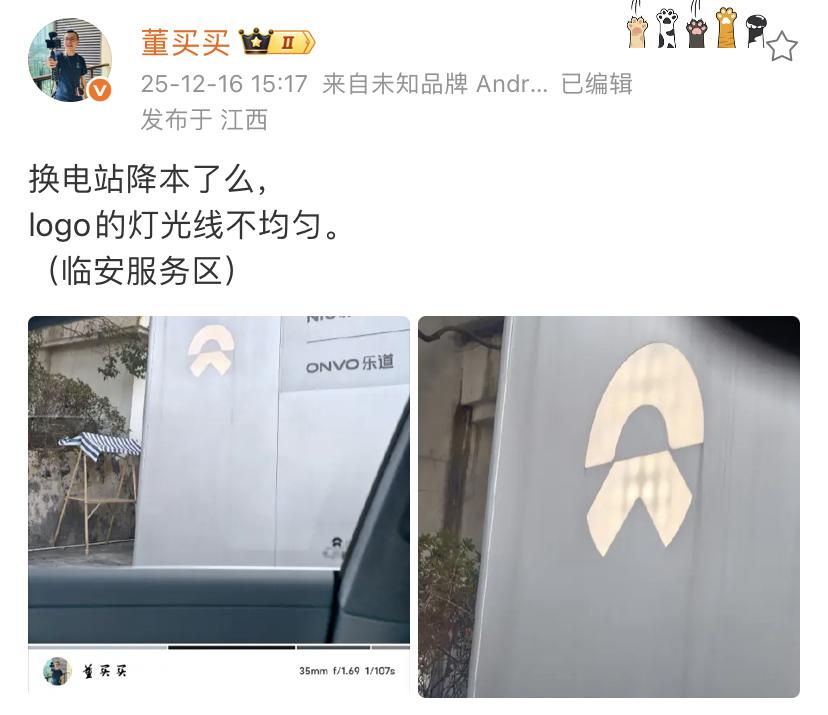 董买买:换电站降本了么,logo的灯光线不均匀。 (临安服务区) 这个是小问题如果后期真的想降本增效的话,完全可以把这个发光的招牌给去了,直接印刷一个不一样的颜色的就可以了。 使用时间长了,像这些东西都是需要维护的,要想一直保持非常好的一个状态,那么表面的清洁工作肯定要做的。 各位是怎么看的?欢迎评论区留言。