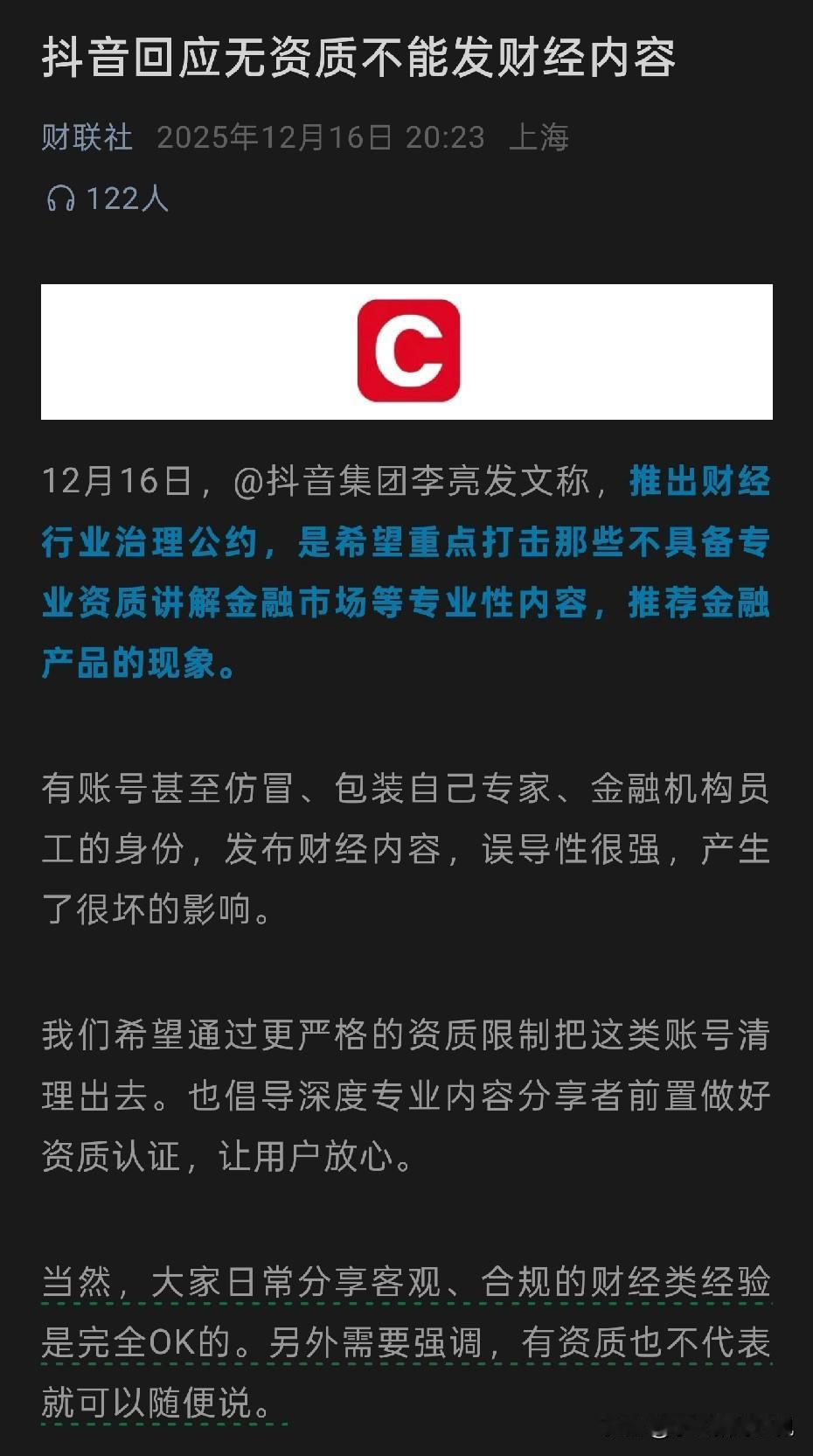 抖音做的不错,希望同为字节跳动旗下的今日头条能进一步跟进,整顿这样的无资质胡说八道。 此前正是因为今日头条没有做相应的约束,还给了垃圾内容不少流量,才让我不得不自己动手开始反诈。当然反诈的同时没有少被那些人网暴。 我的愿望,当然是希望不用我自己再动手。 对了,字节的这个财经资质,还不认CFA这张🇺🇸证书全球证书,我是拿我的证券从业去认证的。当然,在不学无术的各种财经“老师”面前,他们永远是一句资质代表不了什么来为自己开脱[哈欠][哈欠][哈欠]