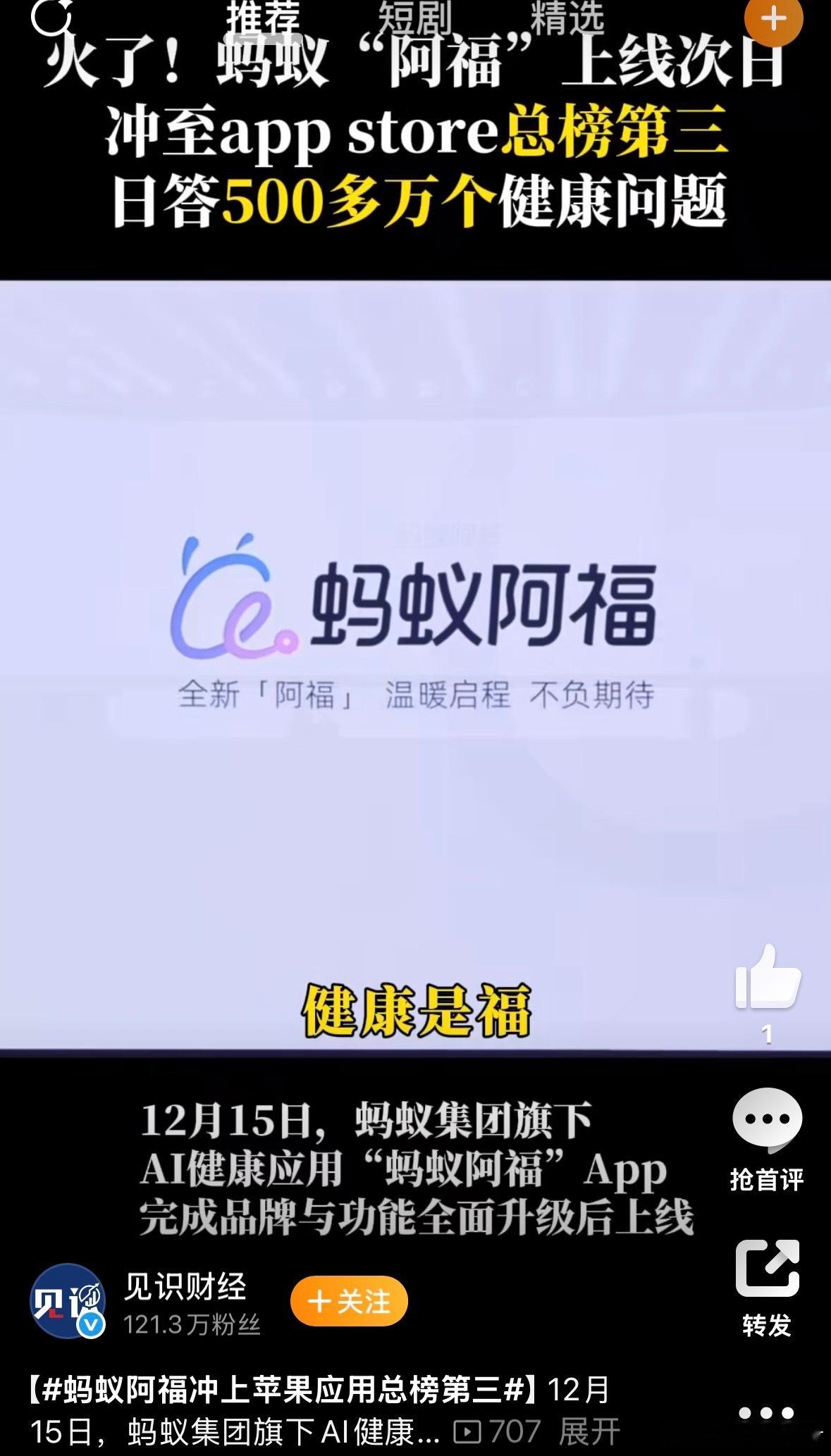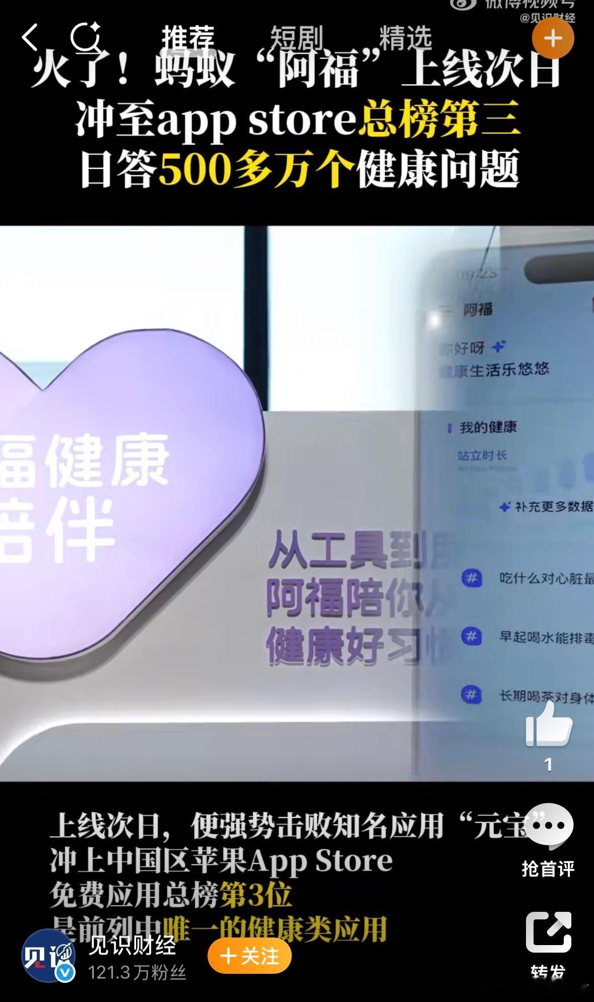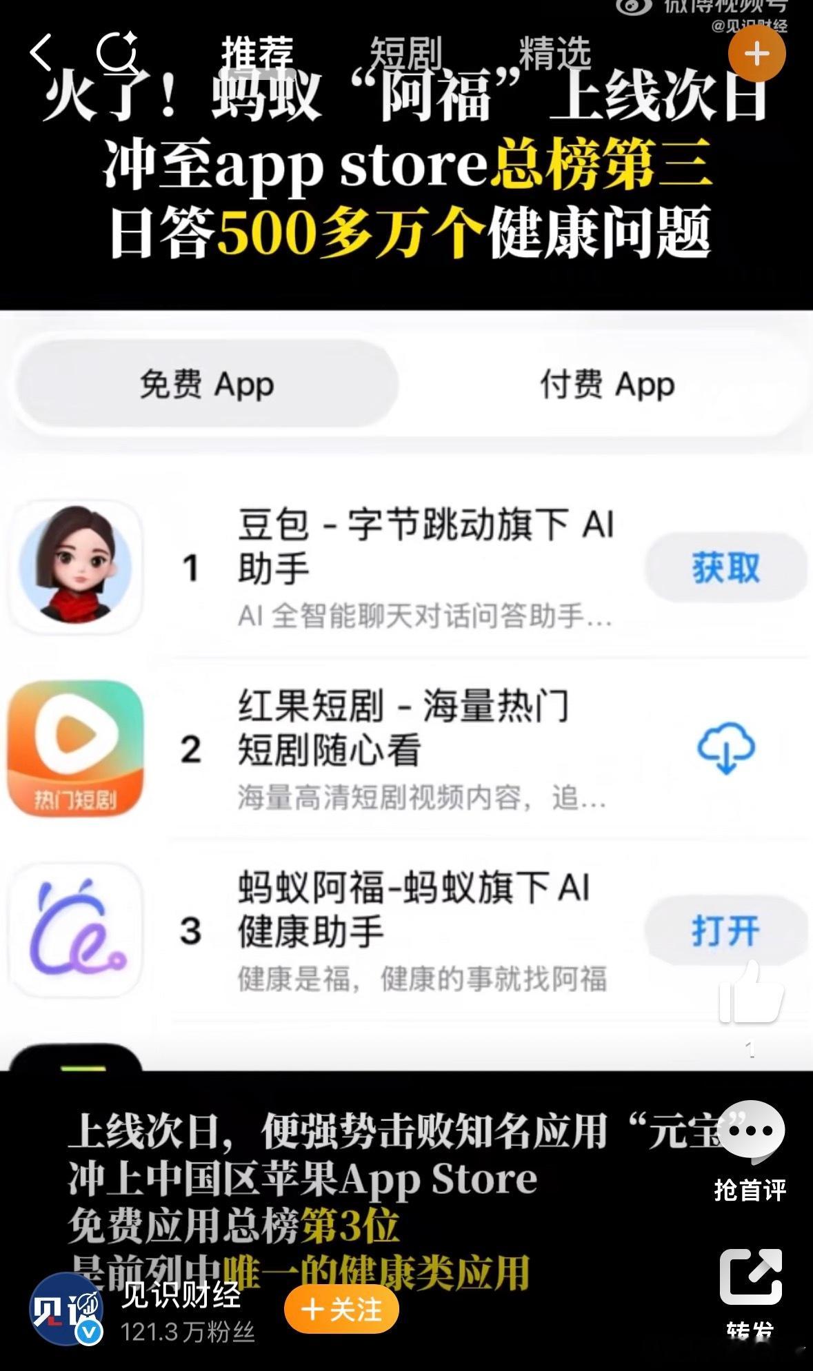 蚂蚁阿福冲上苹果应用总榜第三多少人半夜对着手机查发烧、查失眠,那哪是查答案,是把