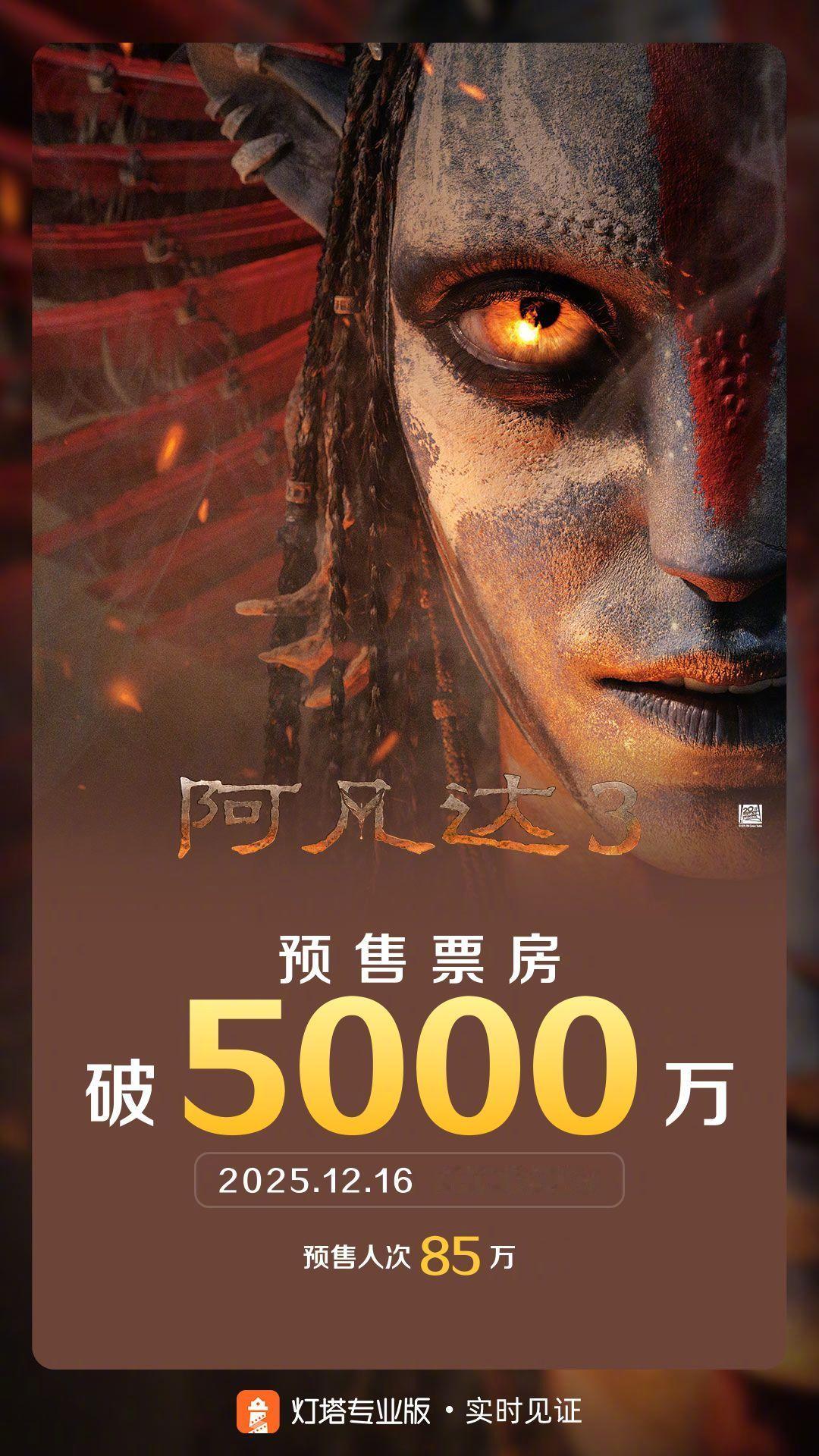 阿凡达3预售票房破5000万 据灯塔专业版实时数据,截至12月16日20时19分,影片《阿凡达3》预售总票房突破5000万。跨年电影愿