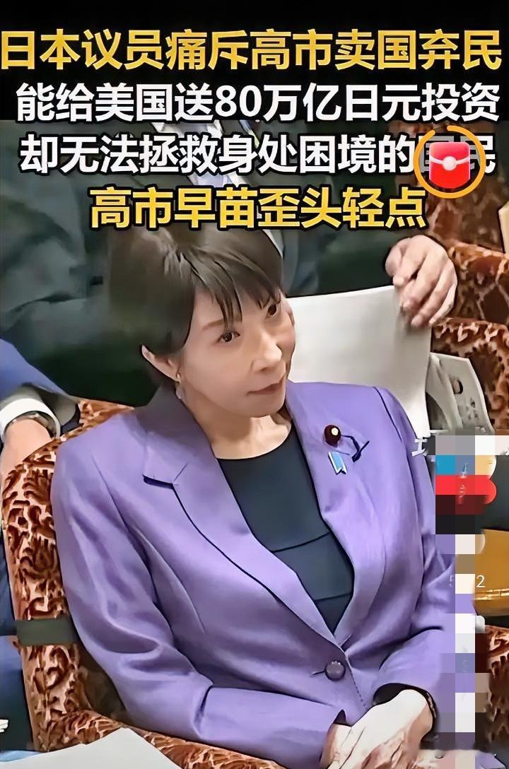 日本议员痛斥高市卖国弃民,能给美国送80万亿日元投资,却无法拯救身处困境的民众,高市早苗歪头轻点。 这笔80万亿日元的对美投资,压根不是平等合作,而是赤裸裸的单向输血。协议里写得明明白白,90%的利润要流进美国口袋,日本只能啃10%的残羹,简直是拿国民的钱给美国交保护费。 日本老百姓的日子早就苦到了根上,核心CPI连续43个月超央行目标,大米价格涨了40%,实际工资却连跌8个月,越上班越穷成了常态。可高市政府连降点消费税都不肯,民生补贴更是抠抠搜搜。 更糟的是,巨额资金外流直接戳穿了日本经济的窟窿。三季度GDP按年率暴跌1.8%,七大车企利润集体下滑三成,产业空心化的口子越撕越大,工人失业的风险就悬在头顶。 高市早苗这种“亲美弃民”的做派,早把日本民众惹火了。首相官邸前的抗议人群举着标语喊她下台,社交平台上“卖国弃民”的话题直接刷爆,她的支持率也跟着一跌再跌。 一边是对美国的挥金如土,一边是对国民的冷漠敷衍,这样的政府,真的配得上日本民众的信任吗? 各位读者你们怎么看?欢迎在评论区讨论。