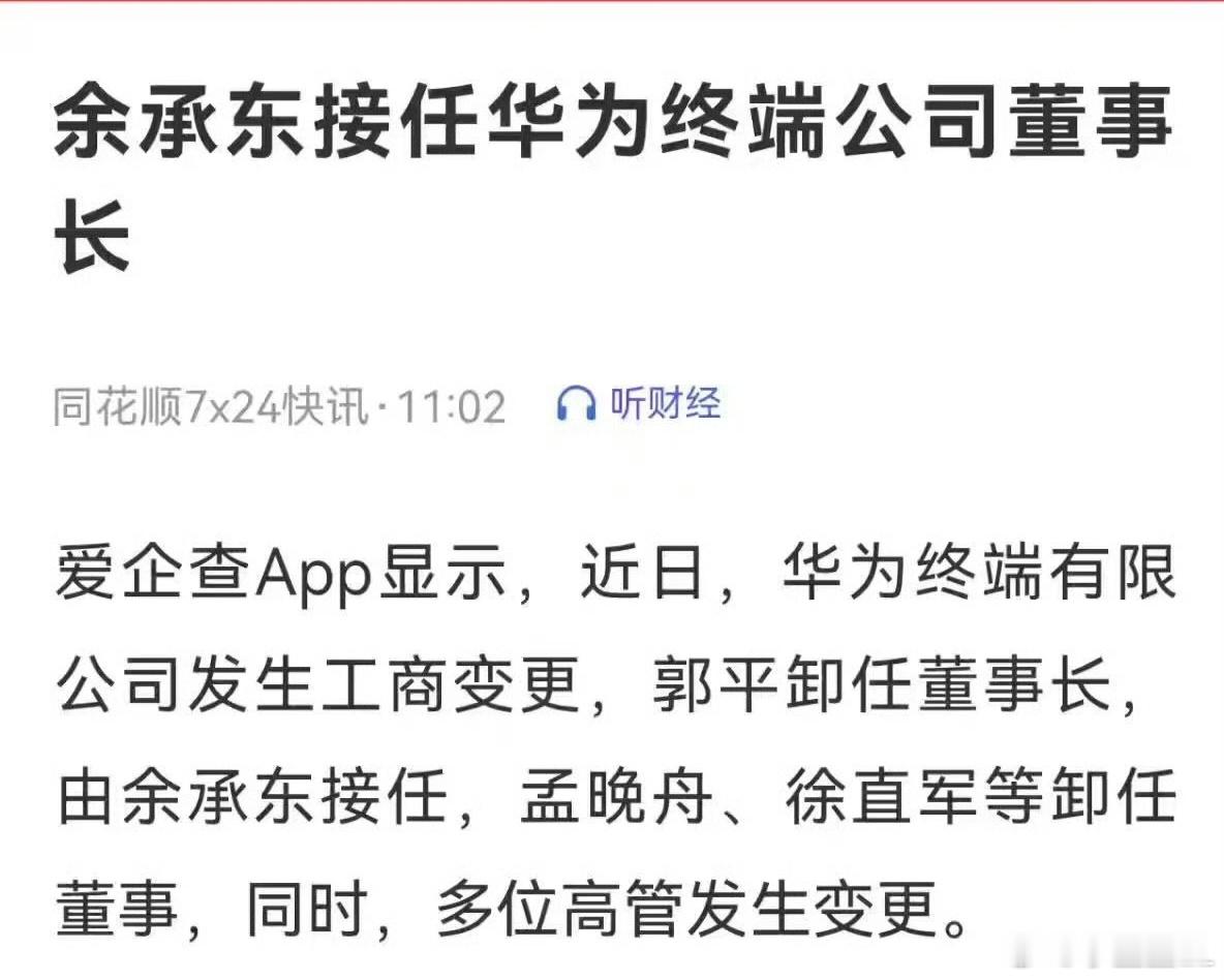 孟晚舟卸任华为终端公司董事余承东接任华为终端公司董事长。