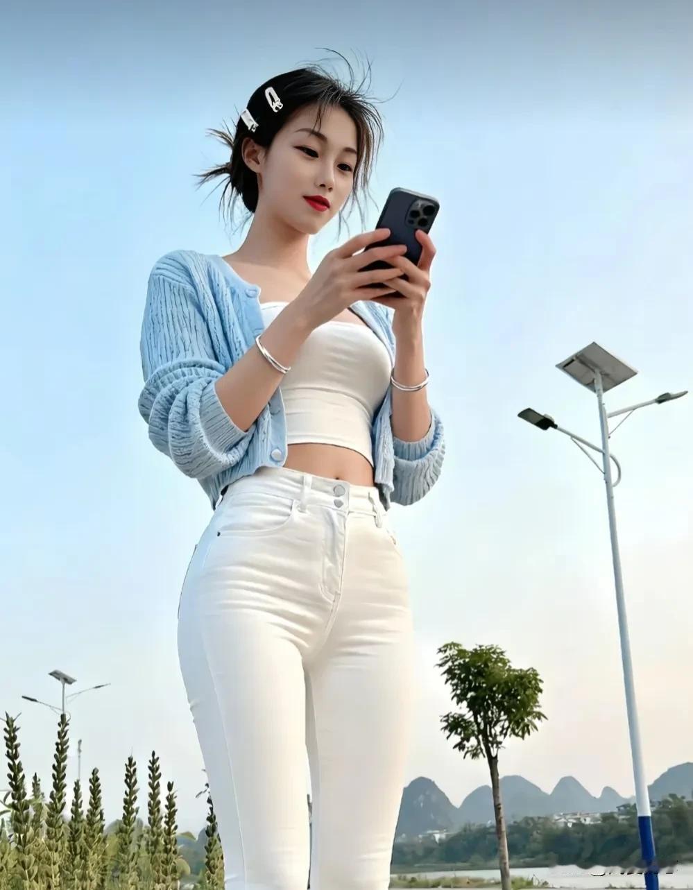 清新穿搭,浅蓝色针织衫+白色牛仔裤,搭配太阳镜,元气满满