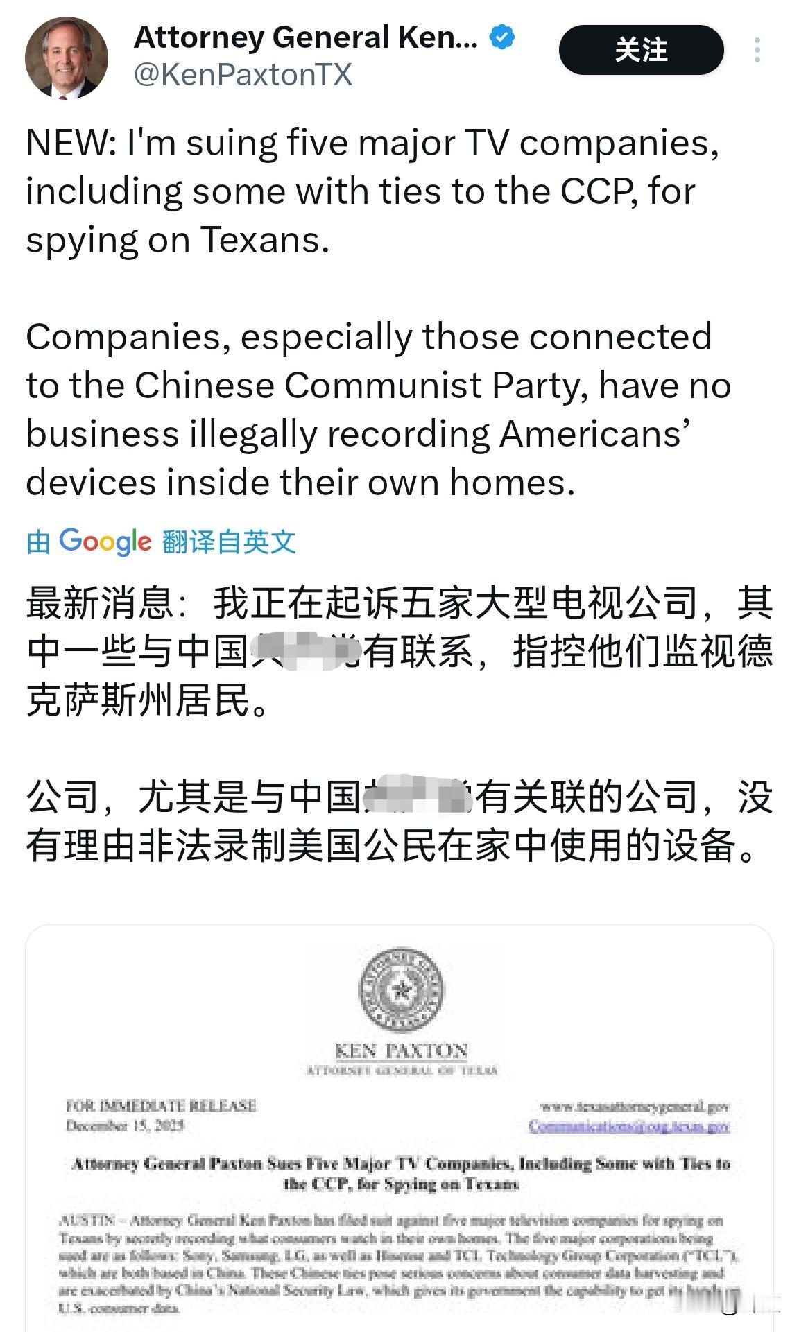 美国德克萨斯州司法部长肯·帕克斯顿竟起诉五家电视公司,指控他们监视德克萨斯州居民。 这五家电视公司分别为:TCL、索尼、海信、三星、LG。帕克斯顿称这几家公司会收集用户数据信息传输回公司。然后,这些公司将这些消费者信息出售给跨平台的目标广告以获取利润。 他还强调,尤其是与中国有关联的公司,没理由“非法”录制美国公民在家里使用的设备。 美国总是指责别人没做,而自己做过的事情。