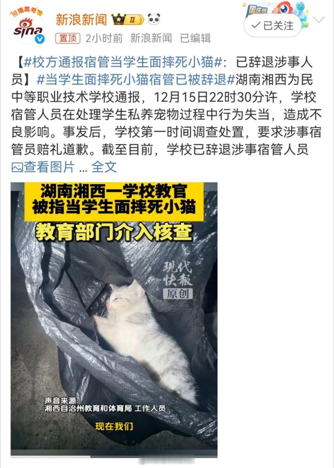当学生面摔死小猫宿管已被辞退今天我看到那个摔猫视频真的觉得很可怕。为什么有些人可以这么冷血,能对一条生命,无辜的小猫下这种毒手。 广州