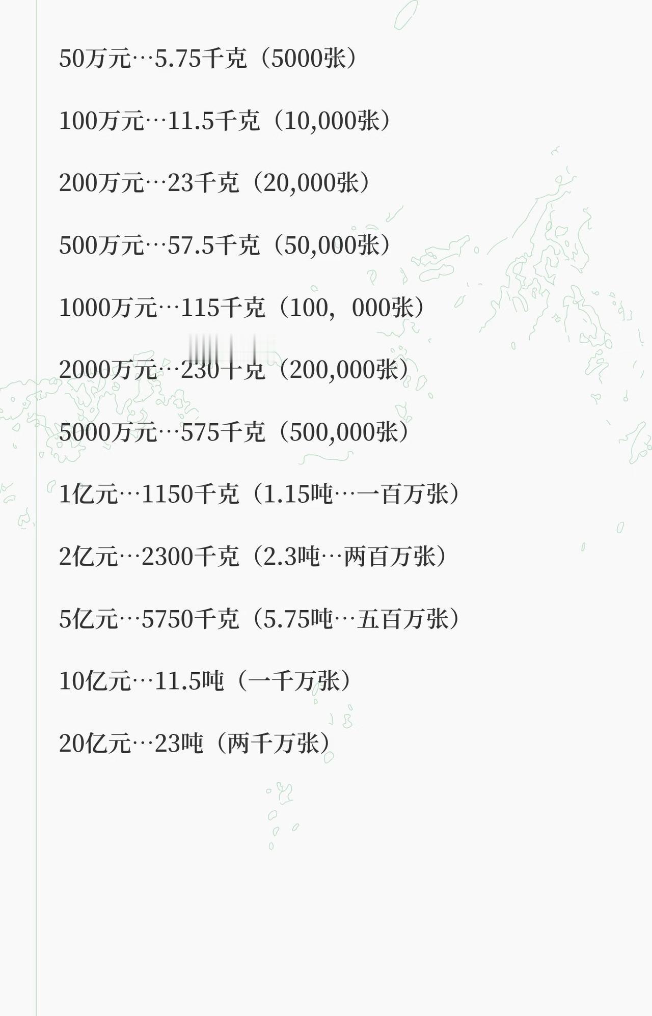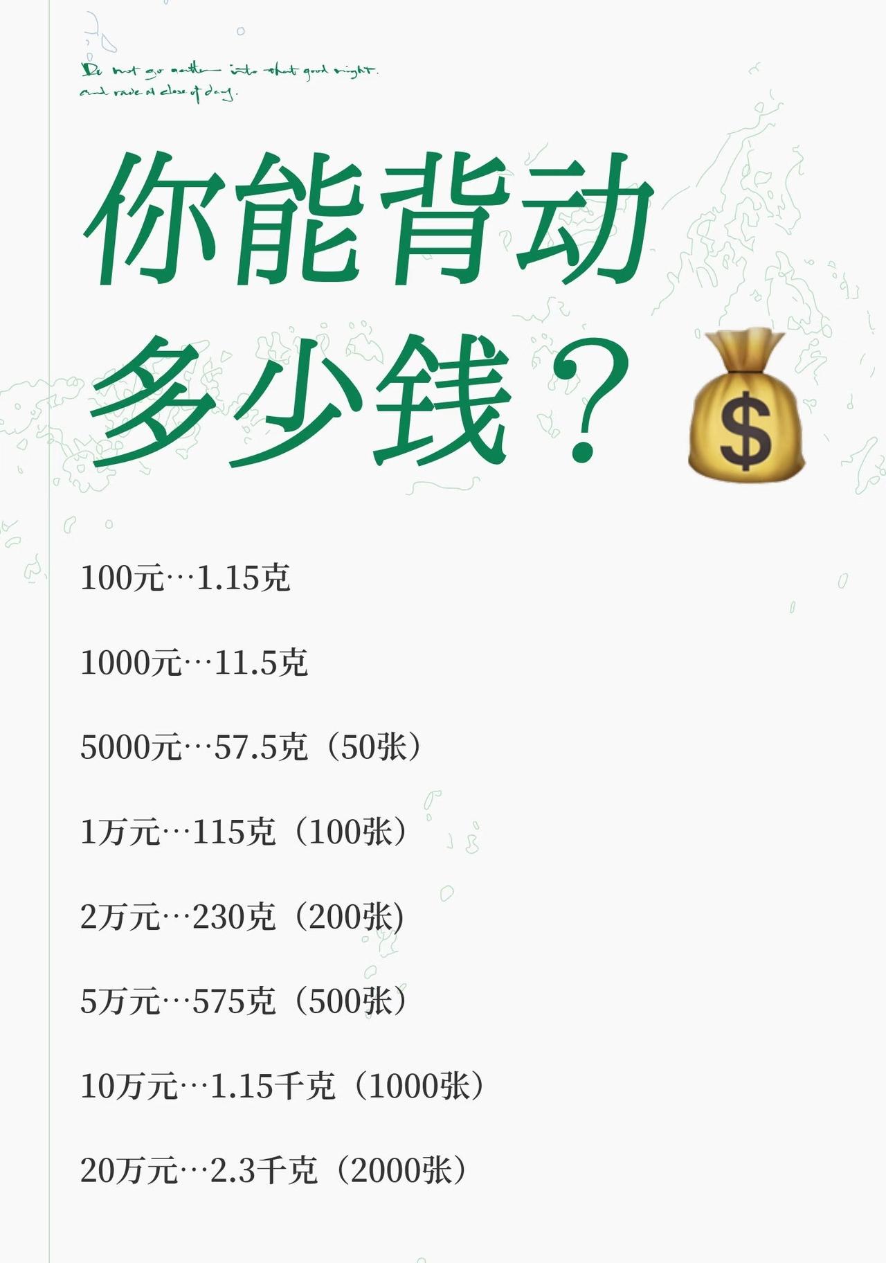 你能背动多少钱? - 100元 → 1.15克 - 1000元 → 11.5克 - 5000元 → 57.5克(50张) - 1万元 → 115克(100张) - 2万元 → 230克(200张) - 5万元 → 575克(500张) - 10万元 → 1.15千克(1000张) - 20万元 → 2.3千克(2000张) - 50万元 → 5.75千克(5000张) - 100万元 → 11.5千克(10,000张) - 200万元 → 23千克(20,000张) - 500万元 → 57.5千克(50,000张) - 1000万元 → 115千克(100,000张) - 2000万元 → 230千克(200,000张) - 5000万元 → 575千克(500,000张) - 1亿元 → 1150千克(1.15吨,100万张) - 2亿元 → 2300千克(2.3吨,200万张) - 5亿元 → 5750千克(5.75吨,500万张) - 10亿元 → 11.5吨(1000万张) - 20亿元 → 23吨(2000万张)
