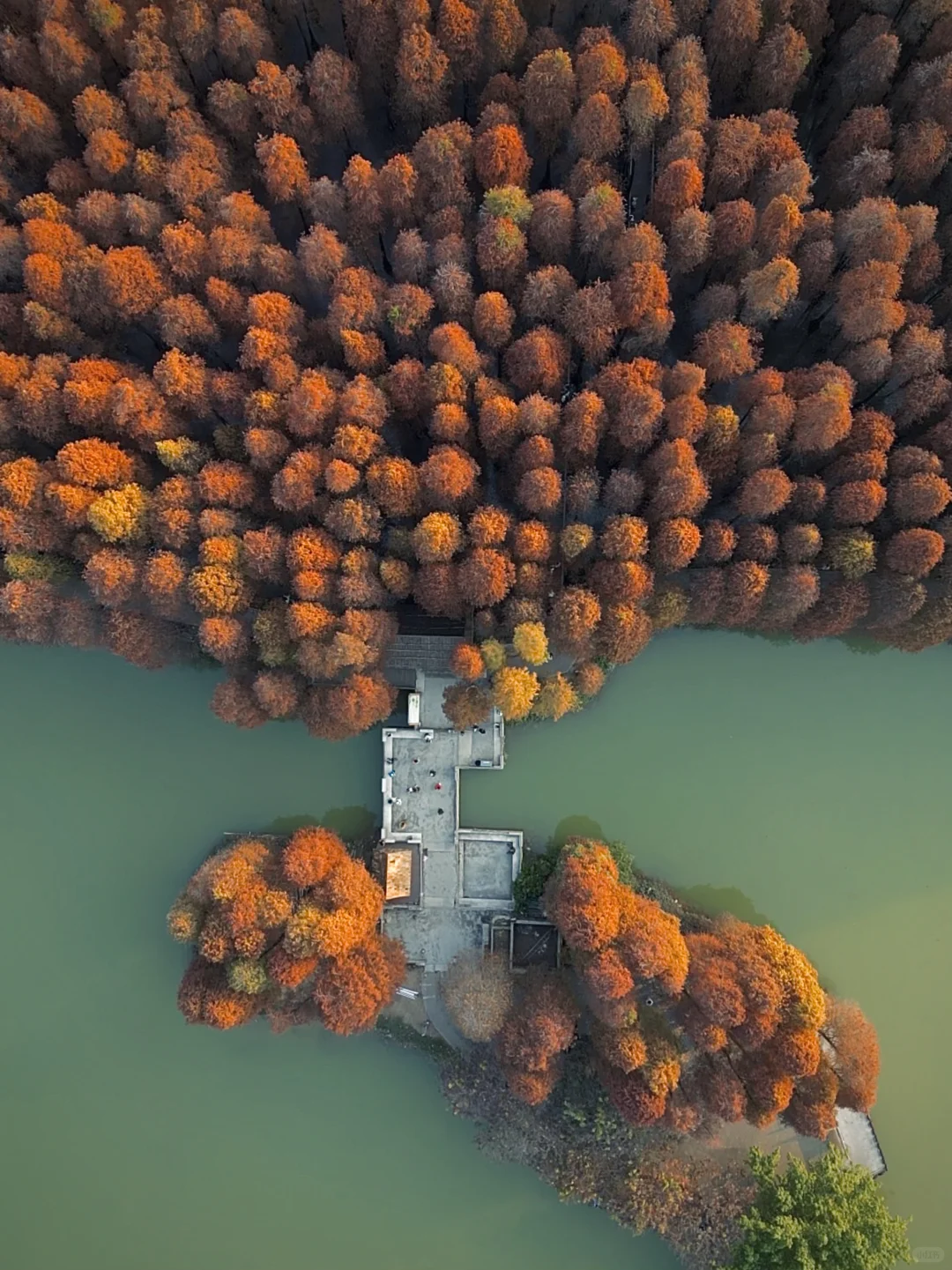 在这里飞无人机俯瞰隔壁桃花岛的落羽杉林也很壮观