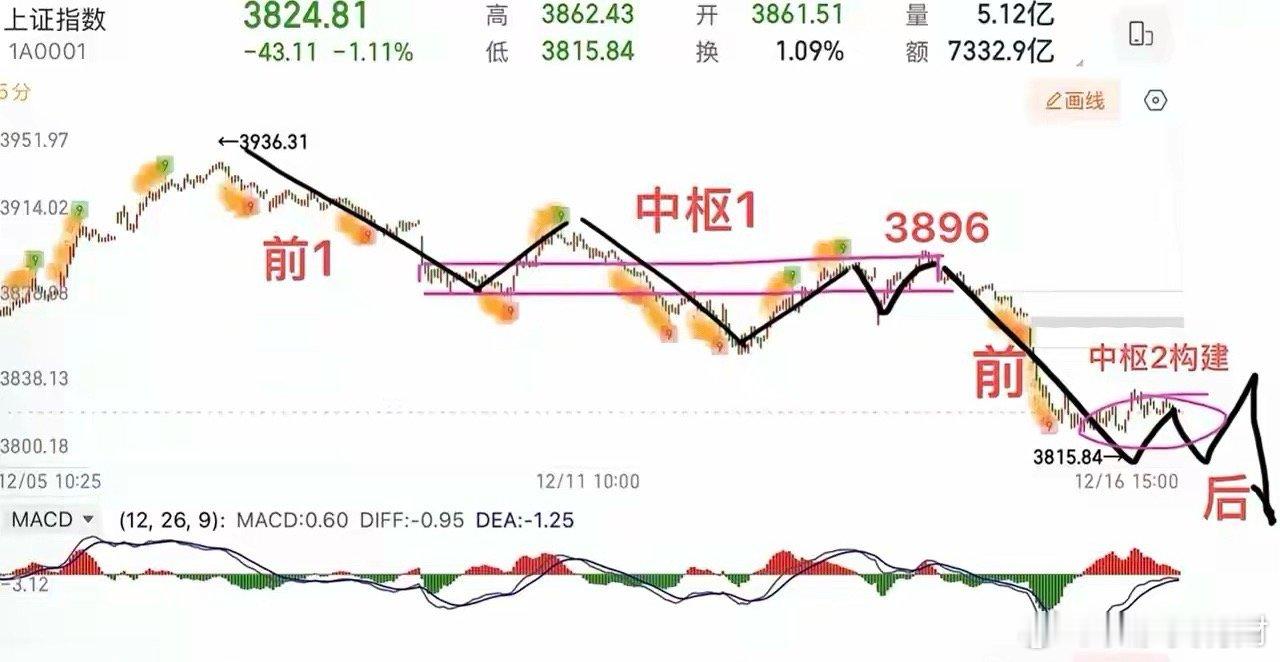 2025.12.16周二收评: 向下变盘,何时止跌进场? 大盘观点:上证指数今天走了个单边加速向下走势,看起来力度还不小,主要指数跌幅均超1%以上,目前来看,还没有止跌信号,大概率还会惯性向下。从均线的角度来看,当前20日线还是主要的关注点,还有1-2天继续向下,下方可以参考120日线支撑,第一次触碰120日线有强支撑。 结构上,今天大盘加速向下,从3896向下的这一笔,对比“前1”段,显示空头力量是在放大的。怎么样才能止跌?首先要看到踩刹车,构建中枢的过程,类似于“中枢1”,所以明天大概率会收一根小k线形态。这个位置再下来,不要害怕,仓位轻的,指数下来其实是可以逐步寻求机会,当下耐心等止跌信号。 从指数的角度来看,真正的买点是要等到中枢2走完,在中枢2的下方背驰段进场,这个需要盘中跟踪,到时候也会给大家提示。 关注每个交易日开盘15分钟早评! 个人观点,仅供参考!