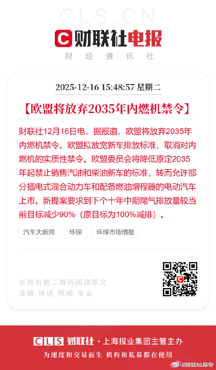 欧盟将放弃2035年内燃机禁令财联社12月16日电,据报道,欧盟将放弃2035年内燃机禁令。欧盟拟放宽新车排放标准,取消对内燃机的实质性禁令。欧盟委员会将降低原定2035年起禁止销售汽油和柴油新车的标准,转而允许部分插电式混合动力车和配备燃油增程器的电动汽车上市。