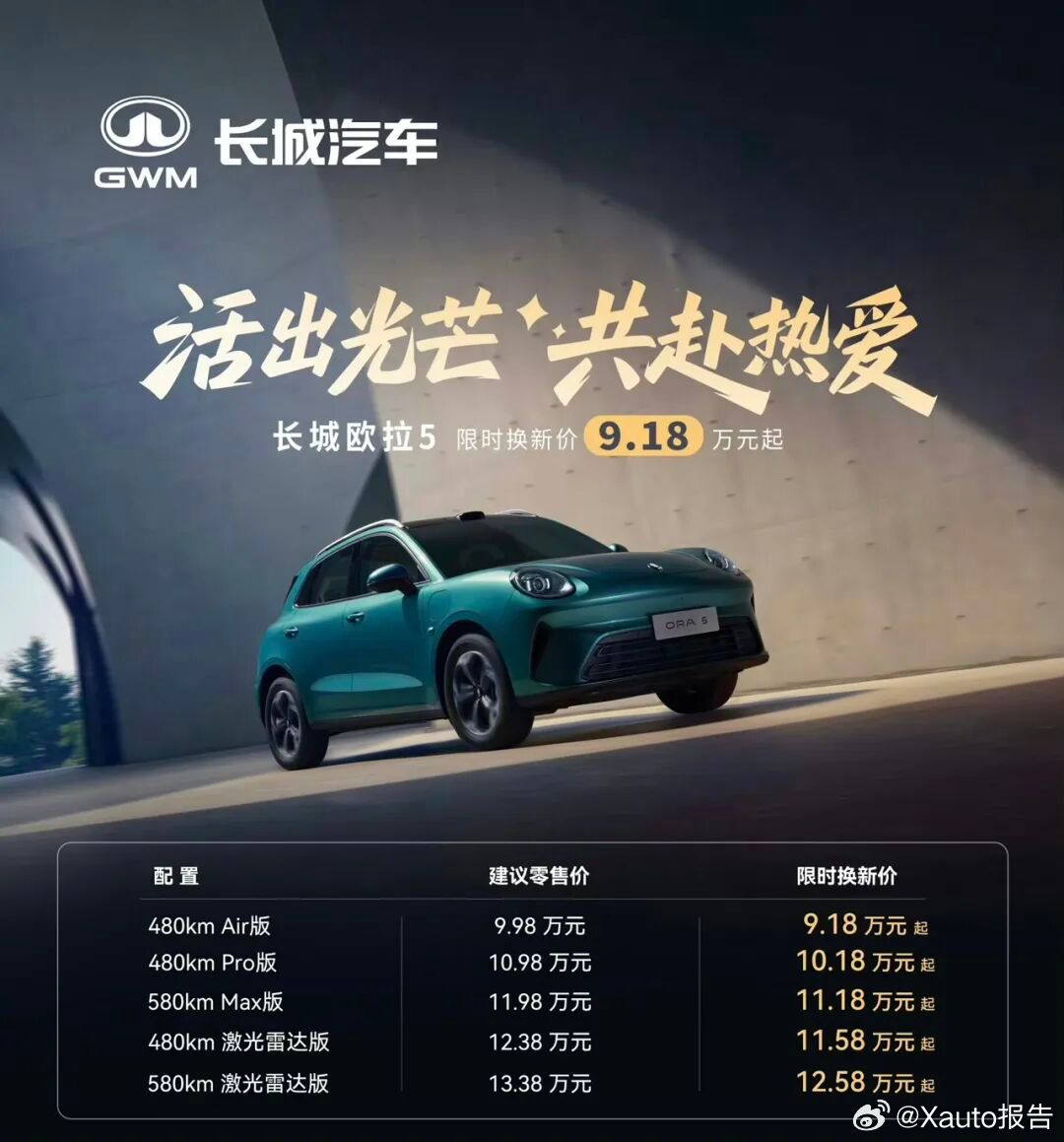 欧拉5正式上市:9.98万元起12月16日,长城汽车旗下欧拉品牌首款纯电紧凑型SUV——欧拉5正式上市。新车共推出5款车型,售价区间为9.98-13.38万元,限时换新价9.18-12.58万元。作为参考,此前新车预售区间为10.98-14.28万元。尺寸方面,新车长宽高分别为4471/1833(1844)/1641mm,轴距为2720mm,定位纯电紧凑型SUV,车内采用5门5座两厢布局。作为参考,2025款欧拉好猫长宽高分别为4242(4254)/1825(1848)/1632mm,轴距为2650mm,定位小型车。内饰部分,新车对车内中控台和门板运用大面积格纹织物面料设计,并提供晨曦白、漫午棕、星夜灰3种内饰配色方案,豪华质感十足。配置上配备悬浮式全液晶仪表、大尺寸中控屏,应用第三代Coffee OS车机系统并集成Coffee GPT功能。动力与续航,搭载最大功率150kW的永磁同步电机,峰值扭矩260N·m,最高车速170km/h,日常通勤超车轻松。提供45.3kWh和58.3kWh两种蜂巢能源磷酸铁锂电池,对应CLTC纯电续航480km和580km,其中快充30%-80%仅需0.33小时,还支持对外放电,适配通勤与露营等场景。魏建军说让每一个零件多工作10年求真长城欧拉5上市发布会长城欧拉5长城欧拉5年轻人的严选车长城汽车