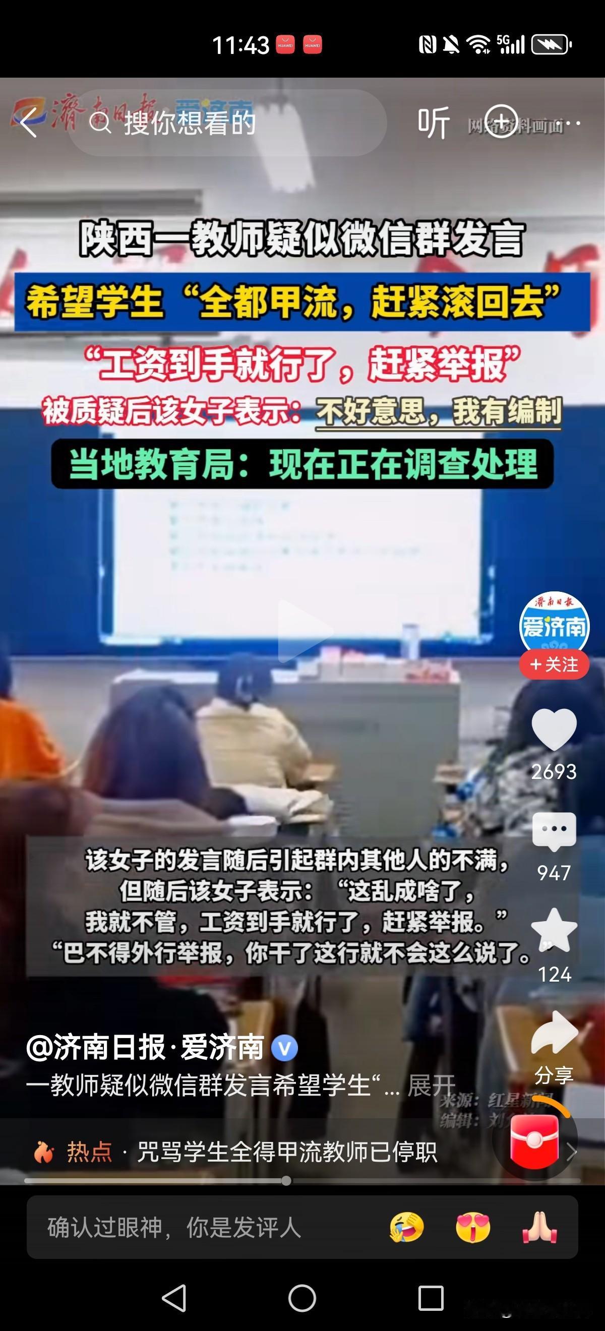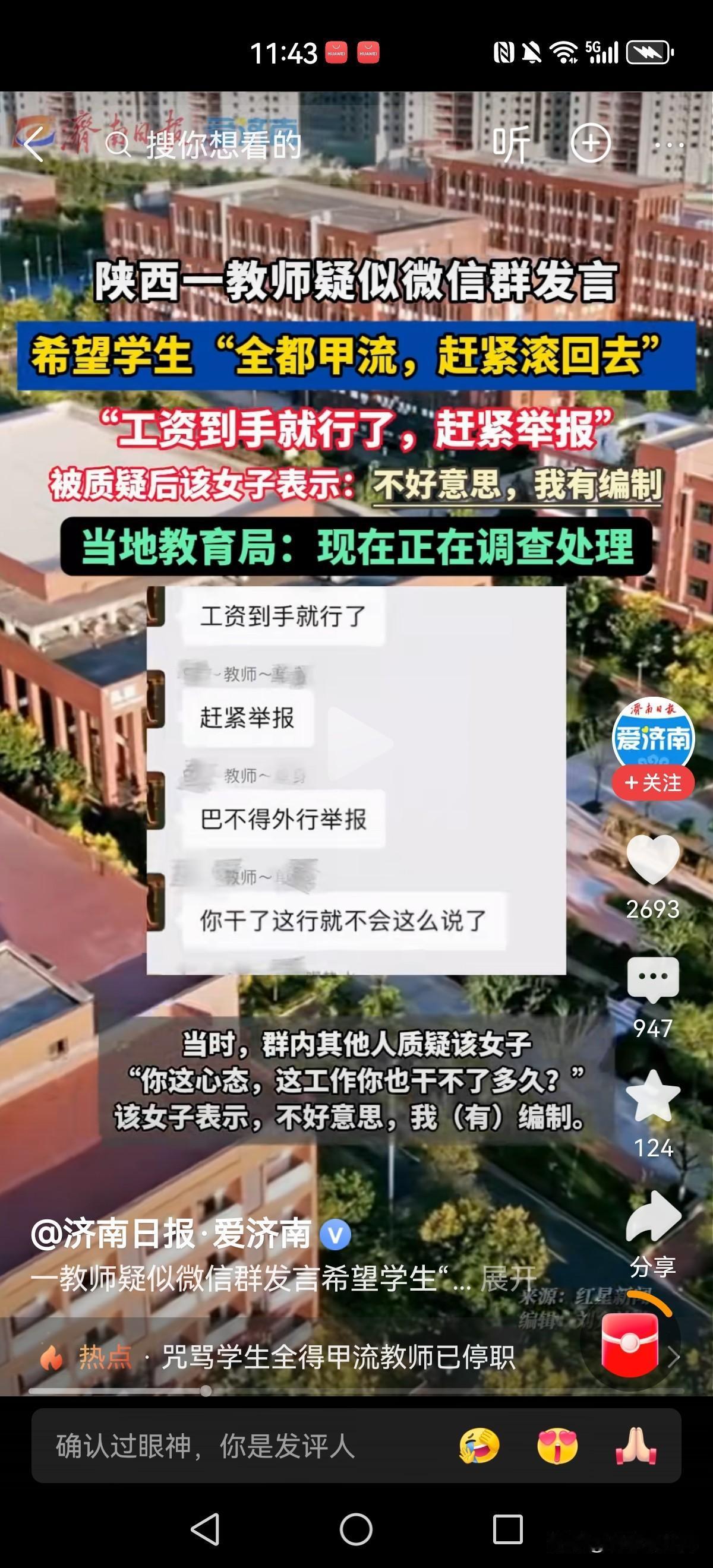 网传陕西省某学校老师微信群发言,希望学生们“全部甲流,赶紧滚回去”。还说自己不怕举报,“赶紧举报,不好意思我有编制”! 如此言行,怎配做人民教师?最起码的仁义道德都荡然无存。必须严惩不贷,以正视听!校园甲流 西安老师 西安老师 宝鸡甲流 陕西高校教师 西安超尘教育 临沂甲流