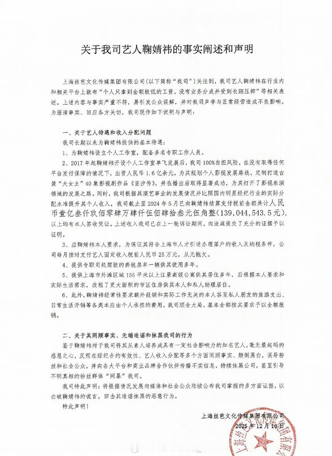 多少?????1.3亿!!!!丝芭刚刚直接公开了给鞠婧祎支付过1亿3千万,支付每个月工资25万,提供上海豪宅居住,还会陆续公布掌握的多方面证据,击破鞠婧祎的谎言。不得不说,内娱钱太好挣了!!!! 鞠婧祎收入