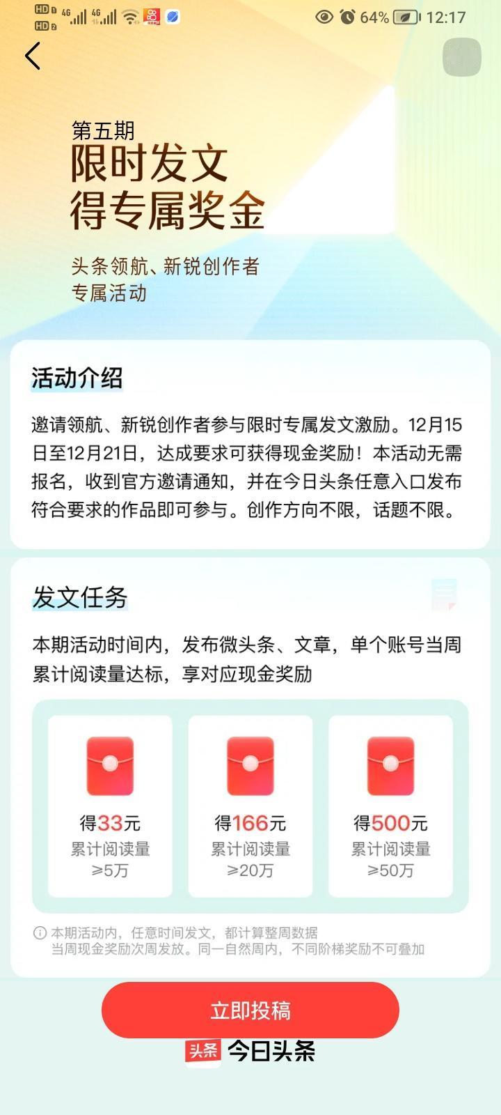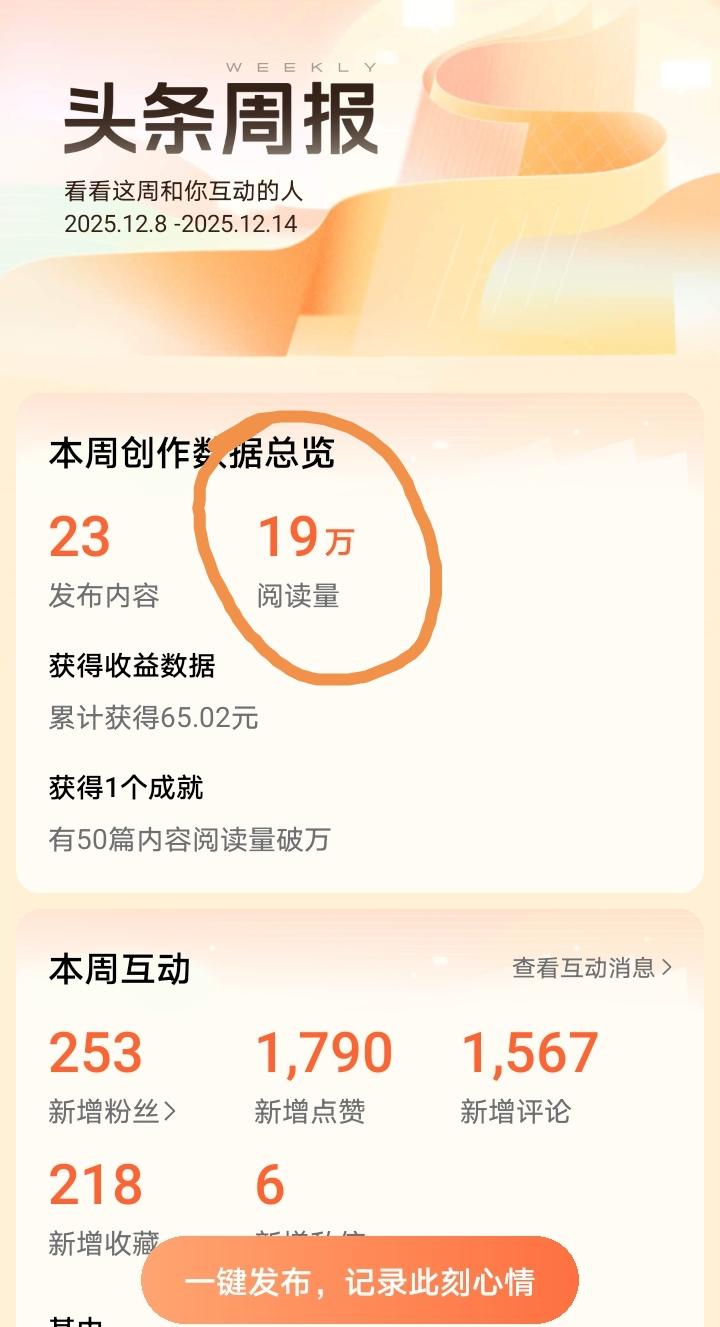 真的有点遗憾没能达标!上周发文任务阅读量达到20万的头条奖励166元!而我上周的阅读量只有19万,刚好差一万!估计这个数据也只有我这个小白才会拥有的黑暗数据了! 这一周新的任务又下来了,这两天的流量也是一如既往的低迷!这样下去,估计连五万的阅读量都危险! 这个阶段,流量低迷,单价低下,放弃又有点舍不得,不放弃又感觉写得没意思!开始迷茫了