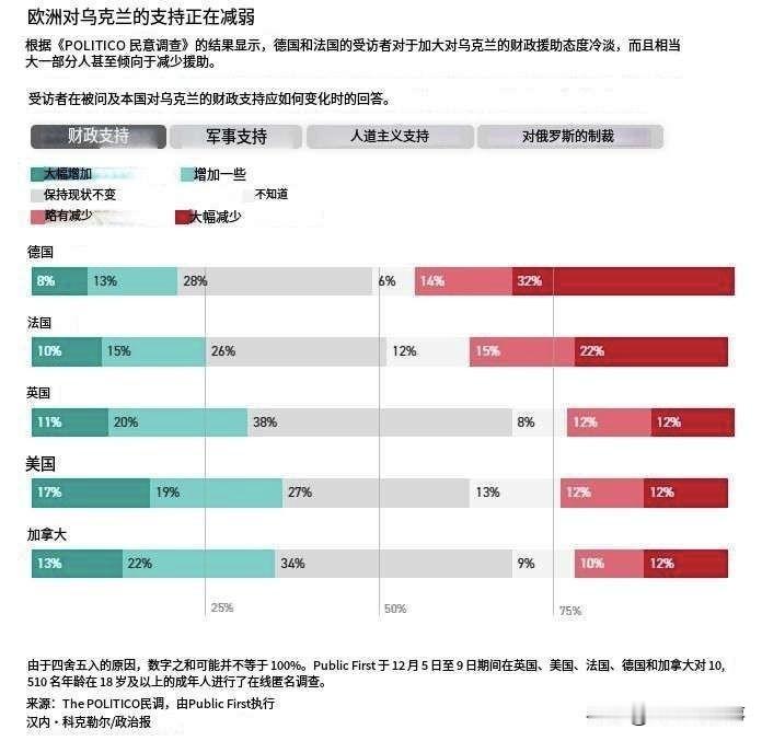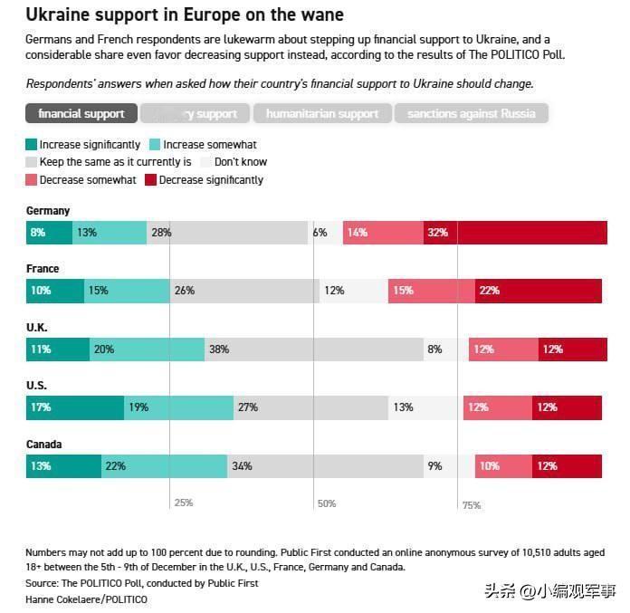 美国《政治报》提供的民调显示,欧洲主要国家民众支持减少对乌克兰的援助。 ▪️46%的德国受访者和37%的法国受访者支持减少援助。支持增加援助的比例分别为21%和25%。 ▪️在英国,支持增加援助的比例更高,为31%,反对者比例为24%。 ▪️美国支持增加援助的比例最高,为36%,反对者比例为24%。加拿大支持增加援助的比例为35%,反对者比例为22%。 ▪️反对援助的人通常认为这会损害本国经济。