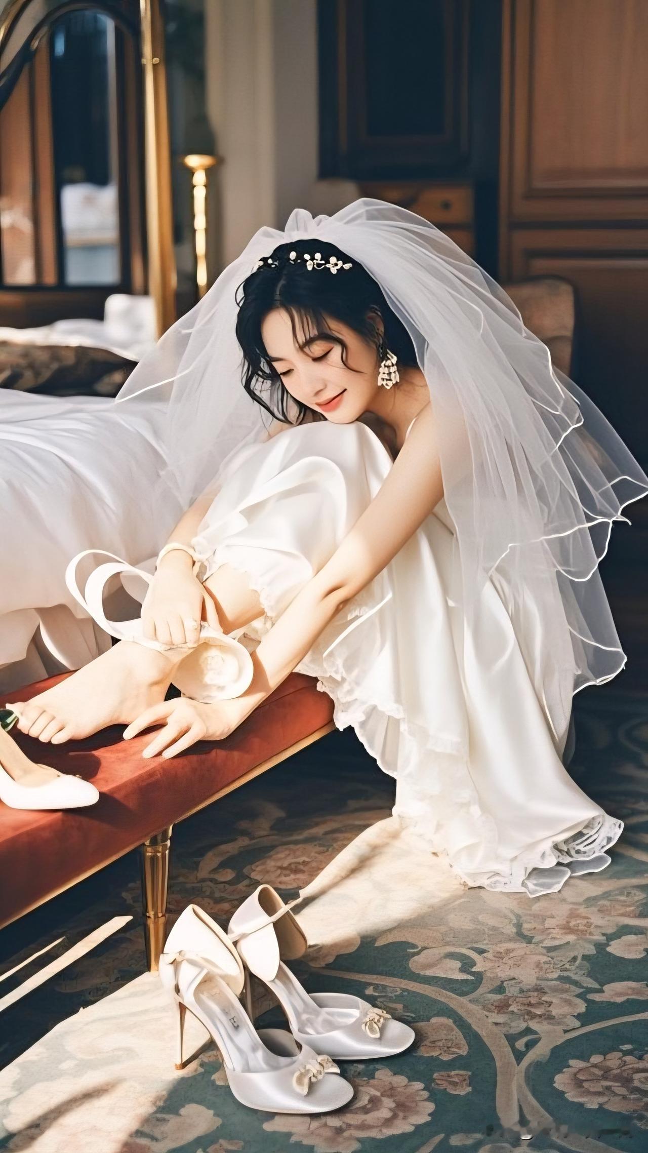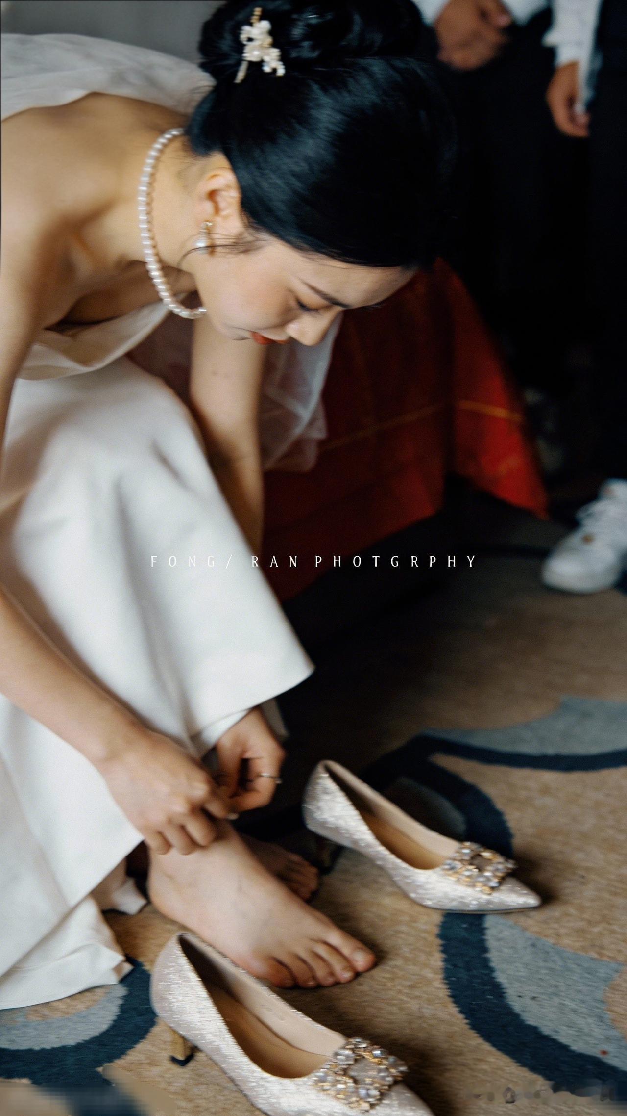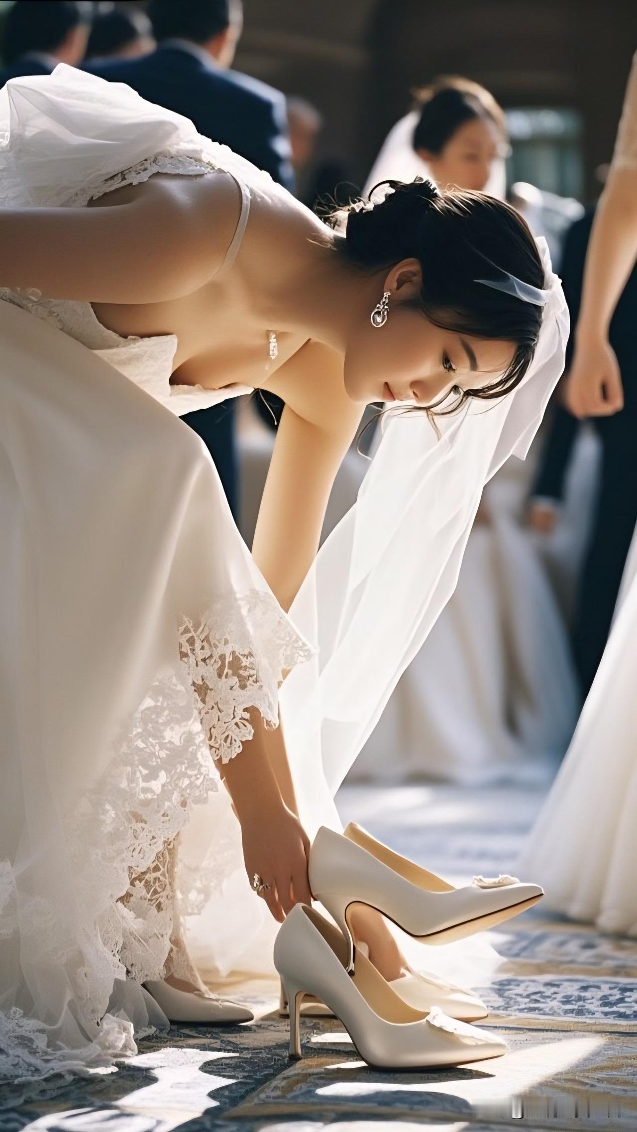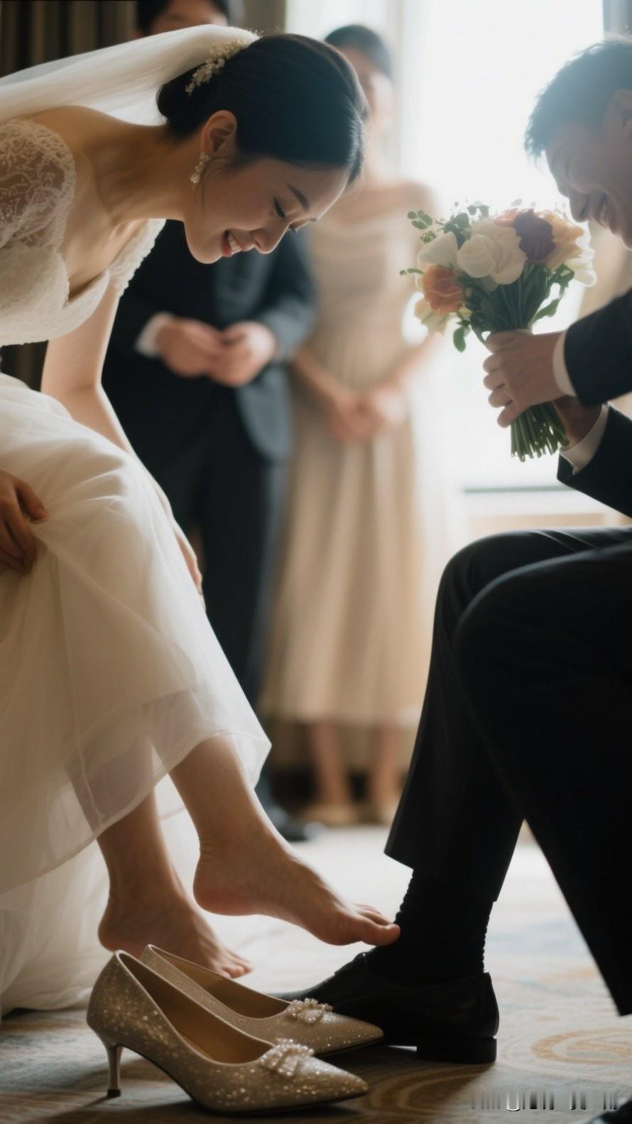 喜结连理的瞬间如梦似幻,瞧那新娘轻柔地穿上鞋子,满溢的幸福感仿佛要从屏幕中流淌出来。在婚礼上,新娘鞋可是不容小觑的重要细节。倘若婚纱裙摆够长,或许还能稍作忽略;但要是会露出双脚,一双美美的新娘鞋便不可或缺。 楔形鞋能够巧妙拉长腿部比例,一字带鞋搭配上浪漫的花朵坠饰,水晶造型的鱼口鞋更是尽显华丽。就像Chloechen2013冬款的白色闪亮麂皮高跟鞋,售价1580元。当然,婚礼上也不乏有趣的小插曲,比如接亲时新娘悄悄穿鞋,一露出大脚丫,喜感十足,把新郎都给弄懵了。这场婚礼,处处洋溢着甜蜜与欢乐。