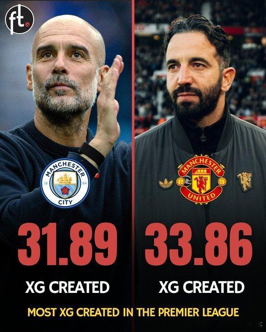 xGPhilosophy:本赛季英超预期进球(xG)最多的球队是曼联。曼联4比4伯恩茅斯 🥇 曼联 —— 33.86 xG🥈 曼城 —— 31.89 xG