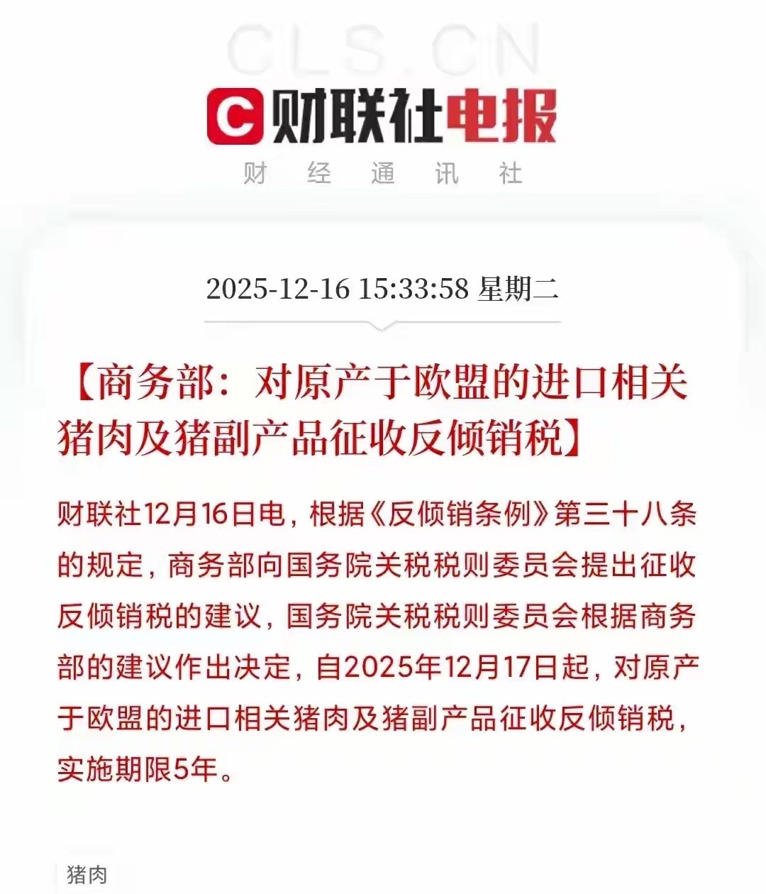 好消息!5年反倾销税落地,养猪股春天来了?刚刚,商务部通报,自2025年12月17日起,对原产于欧盟的进口猪肉及猪副产品,征收反倾销税,实施期限为5年!这是对国内养猪产业的保护,也是改变行业格局的信号!为何此时出手?这次反倾销调查,历时接近一年,才裁定落地。这几年,欧盟猪肉凭借价格优势,大量进入国内,对国内生猪养殖业,造成了较大的冲击。征收反倾销税目的是,纠正这种不正常的贸易行为,为处于周期底部的国内养殖企业,筑起一道重要的防护墙。三大影响,关乎我们的餐桌和钱包:1. 国内养殖龙头,迎来喘息的机会反倾销税,将抬高欧盟进口猪肉的成本,削弱其价格竞争力。这意味着国内猪肉市场的供给压力,将得到缓解,为牧原股份、温氏股份、新希望等,养殖龙头提供价格修复窗口和盈利空间。行业困难的时刻,可能将要过去。2. 猪周期,有望提前迎来拐点当前生猪价格,仍然处低位,行业持续亏损。减少低价进口冲击,有助于稳定国内市场预期,加速去产能。这将推动本轮漫长的猪周期,提前迎来价格反转的拐点。3. 从饲料到肉制品,全面受益养殖端的边际改善,将向整个产业链传导:饲料板块(海大集团)、动物保健板块(生物股份、中牧股份)、以及屠宰和肉制品板块(双汇发展)的盈利预期,都有望得到改善。这次的战略,不仅关乎猪肉,也传递出在农产品领域,保障内需供应链安全的信号。养殖龙头:牧原股份、温氏股份、新希望等。成本控制能力强的头部企业,将享受供需格局改善的红利。产业链配套:饲料(海大集团)、动保(生物股份)、屠宰加工(双汇发展)等板块的景气度,将紧随养殖端回升。种业和安全:这才的调整,显示了粮食和农牧,供应链自主的重要性,育种等农业芯片环节,战略地位将持续提升。坐稳扶好!这是一场从贸易战略,到产业周期,从养殖场到资本市场的连锁反应。深耕主业的龙头企业,其价值重估的时刻,已经临近了。
