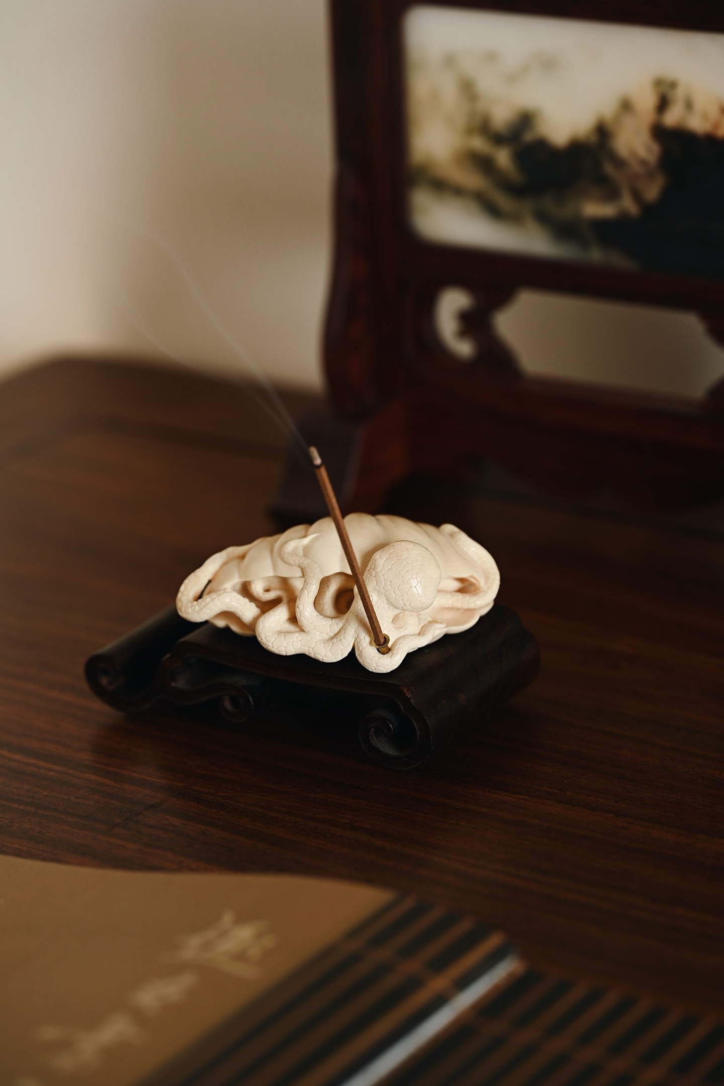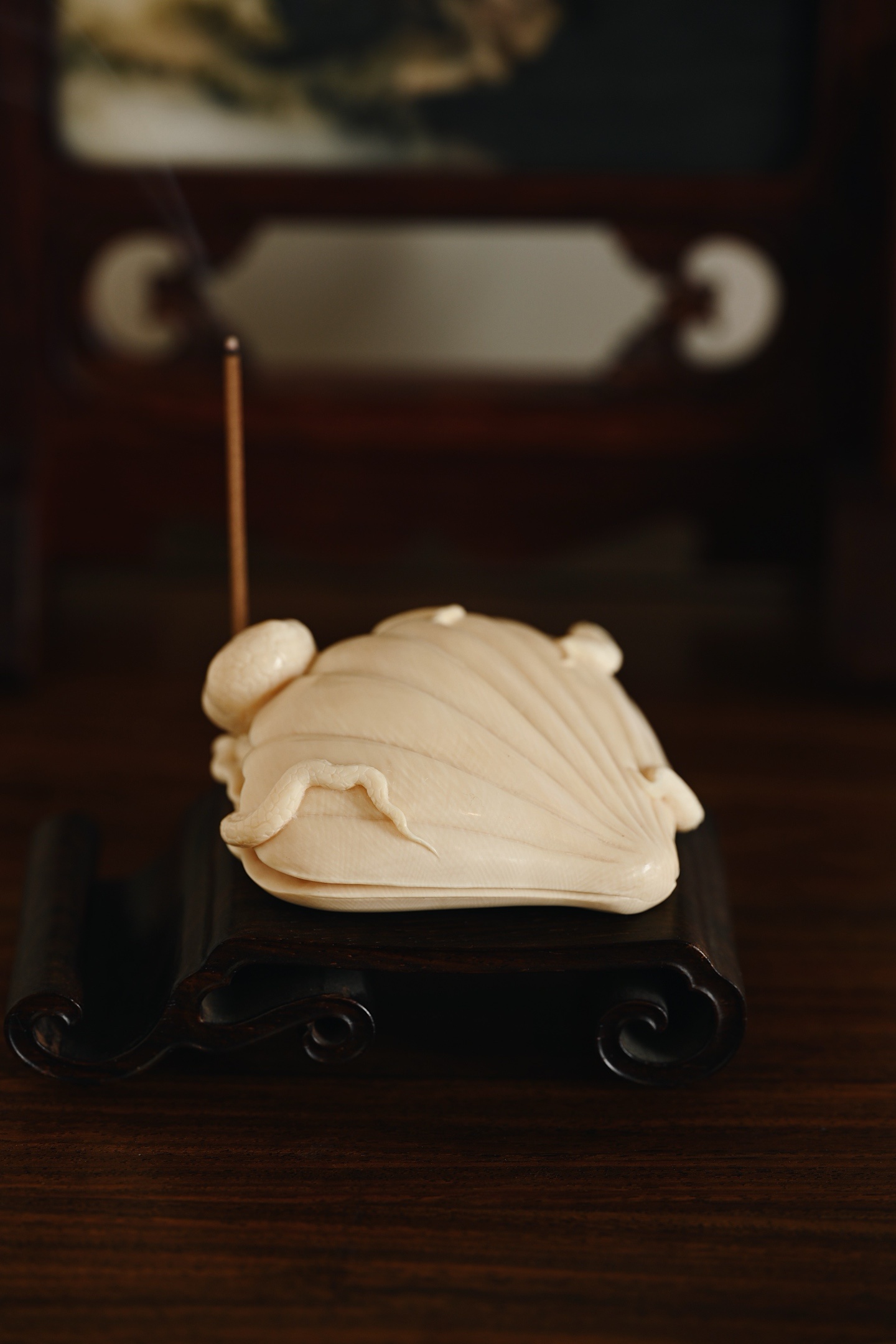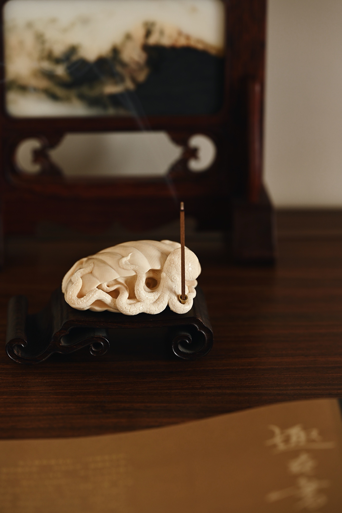 猛犸 | 八方来财 香插全手精心雕作,刀法工致精微却不失灵动气韵,贝壳莹润饱满,章鱼足爪游动,如揽八方财源。入案焚香,足添意趣。8.3*7.8*3.2cm 113g