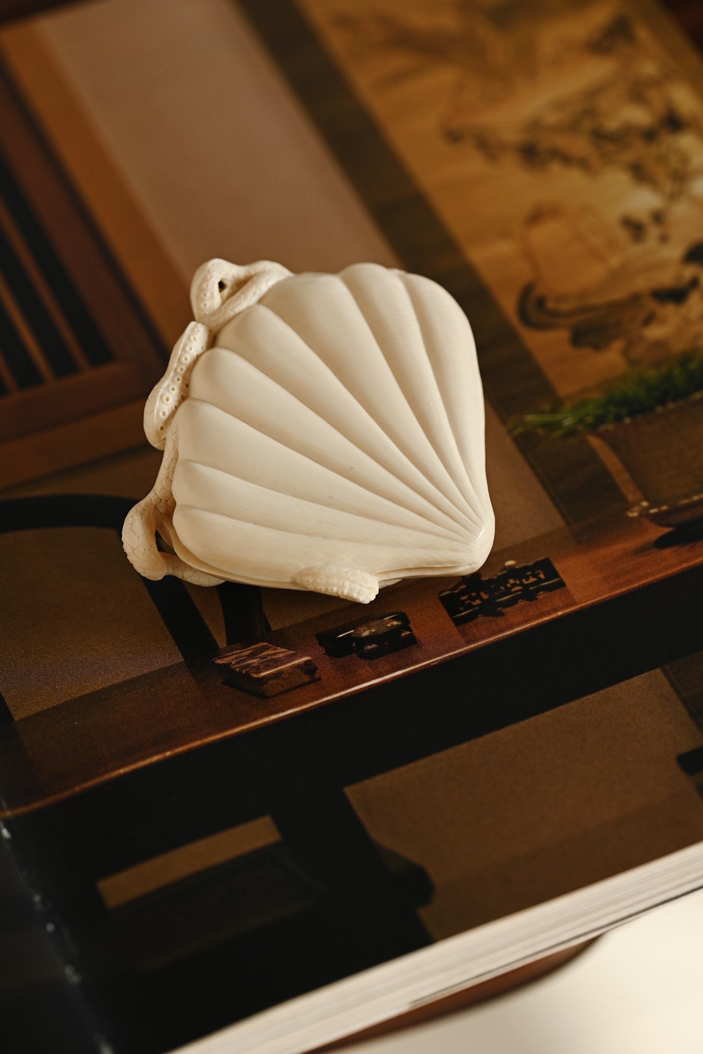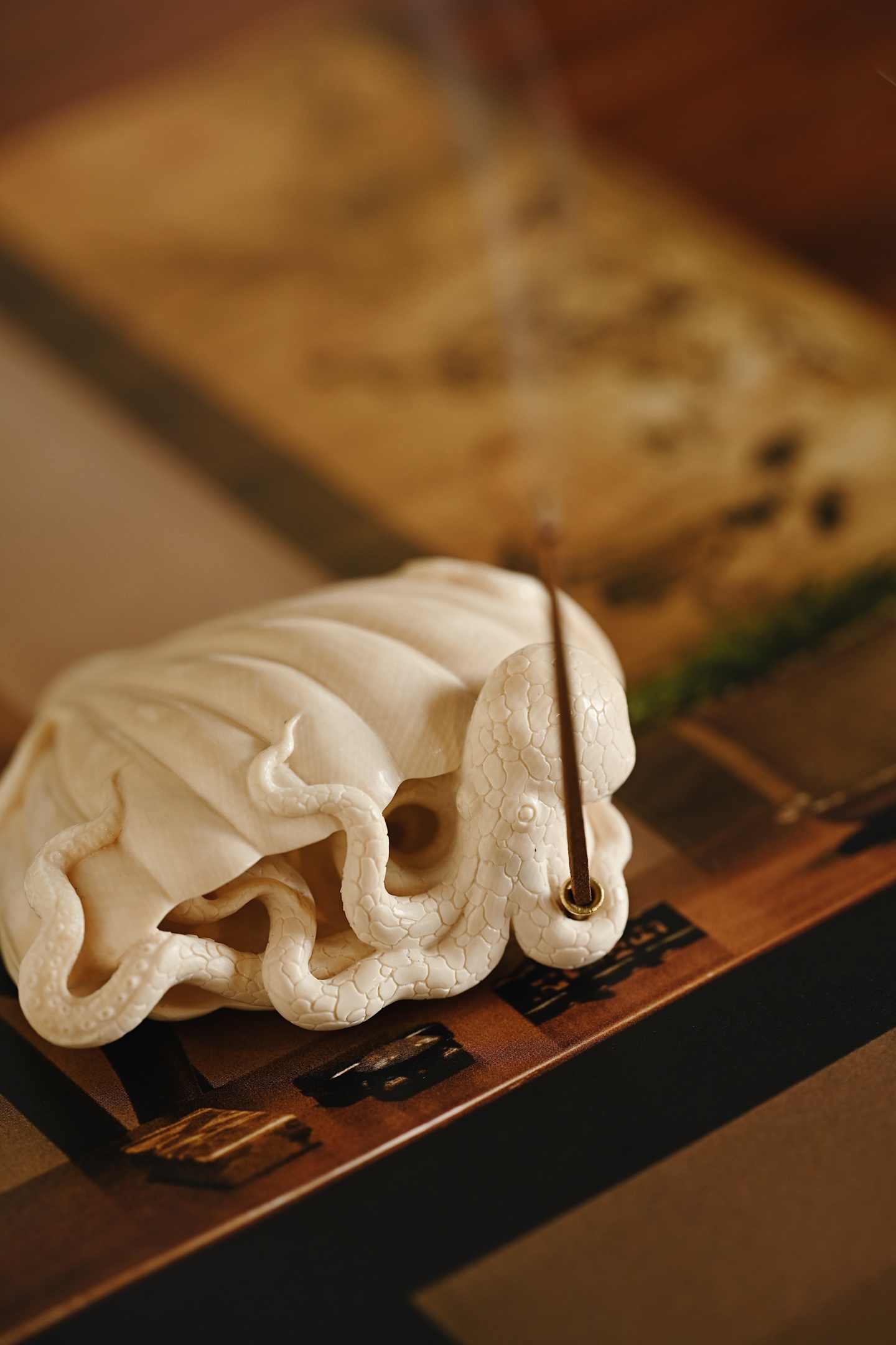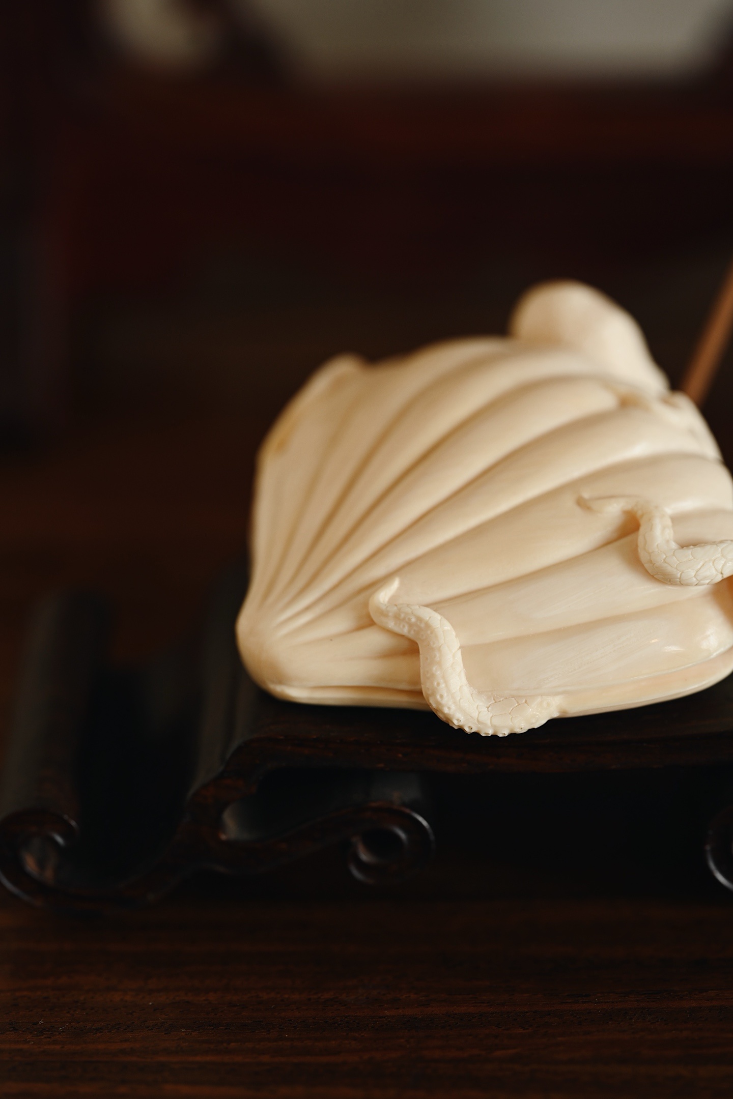 猛犸 | 八方来财 香插全手精心雕作,刀法工致精微却不失灵动气韵,贝壳莹润饱满,章鱼足爪游动,如揽八方财源。入案焚香,足添意趣。8.3*7.8*3.2cm 113g