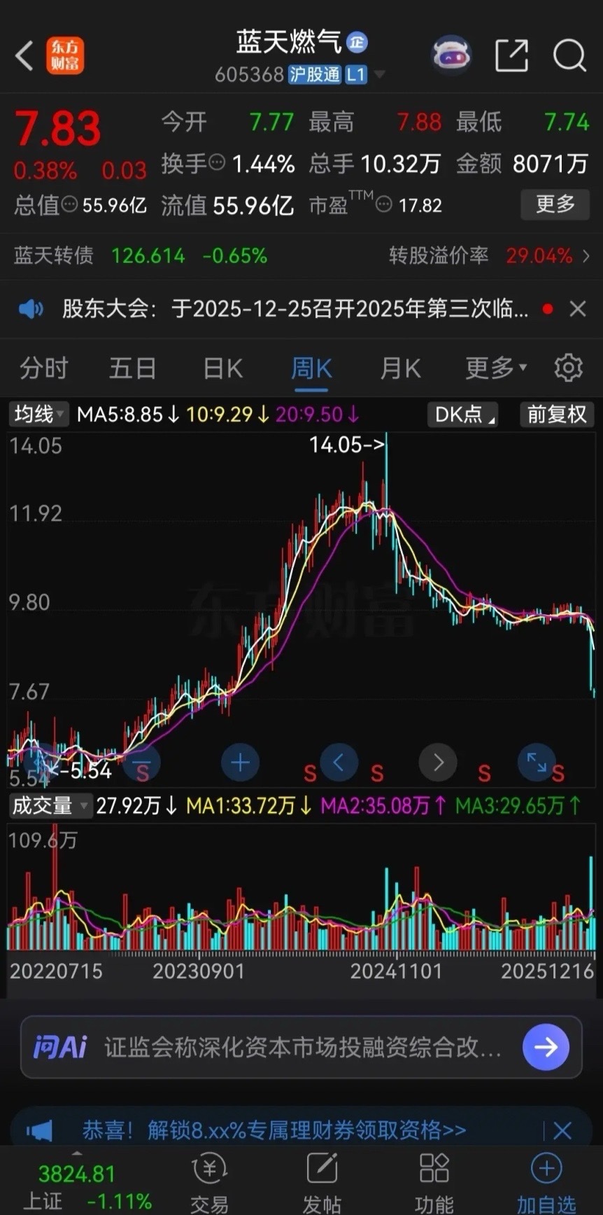 高股息,很多时候都是陷阱!蓝天燃气最近两年,每年都是两次分红,2024年分别是10派8.5元和10派4.5元;今年是10派4.5元,10派4元,股息率高达10.86%。光看这分红,哪个股民不眼红?我敢说买它的股民99%都是奔着它的股息来的。然而公司股价今年一直震荡下跌盘整,从3月份到12月初都是盘整状态,这几天却突然一路崩盘式下跌,4个交易日从9.27元跌到了7.70元,跌幅高达17%,较去年的高点下跌了45%。而这一跌,公司股价也创出了近两年以来的新低。这就意味着,这两年奔着股息进来的股民全部被“活埋”!你看上的是它的利息,人家却要的是你的本金!