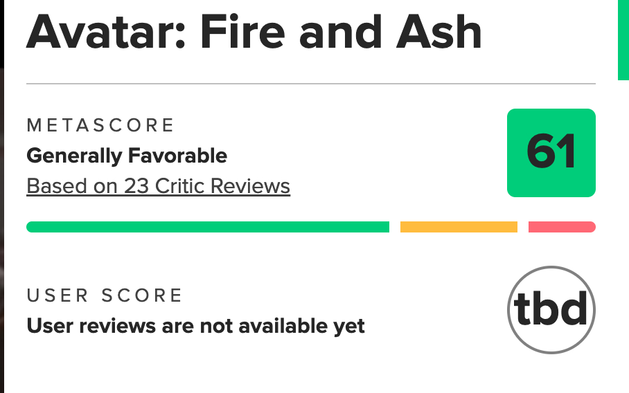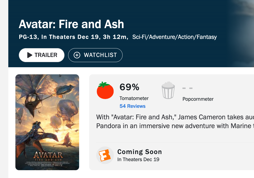 《阿凡达:火与烬》烂番茄已经开分了,54个媒体打分,只有69%的媒体评分新鲜度。同时,metacritic只有61分,确实有点低了,基本是系列最低了。评价方面也都是预料之中,都是视觉依然封神,但故事原地踏步,甚至退步。