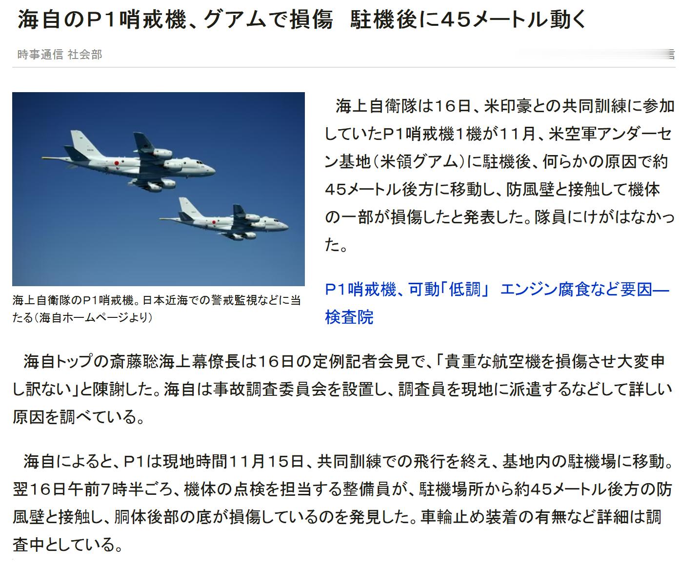 海自1架P-1在关岛参加美印澳日联合演练时,溜车撞护墙上?