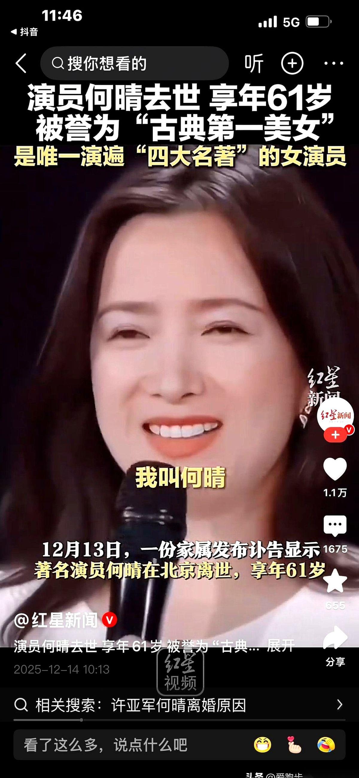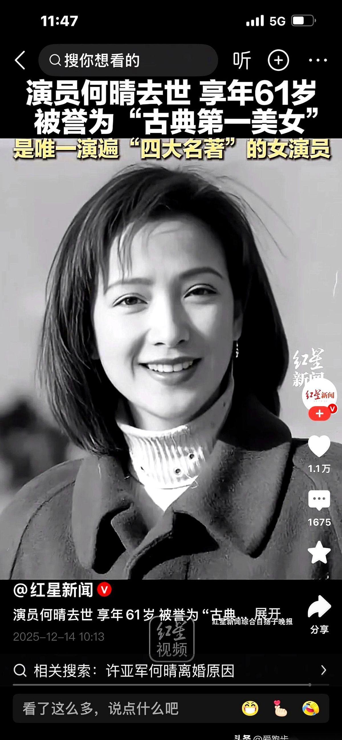 刚刷到消息,何晴,走了。61岁,癌症。 心一下就沉到底了。 那可是我小时候挂历上最美的人啊,《一代名妓李师师》,谁没看过? 61岁……现在这个岁数,还算老吗?真不算了。 身边这个癌那个癌的,听得人耳朵都快起茧子了,越来越年轻。以前总觉得这玩意儿离咱们十万八千里,现在呢?就在朋友圈里,就在饭桌上,就在某个你以为很平常的下午,一个电话打过来,天就塌了。 突然想起今天看到一个53岁的阿姨,一个人跑步。 不混圈子,不追配速,耳机一戴,谁也不爱。就那么慢慢跑着,她说,为健康。 那一刻我突然觉得,这阿姨才是真正活明白了的人。 她在跑,但她没在“卷”。 我们呢?我们在卷什么?卷谁的工资高,谁的房子大,谁家孩子上的补习班牛逼。 拼命拿身体换钱,想着等我怎么怎么样了,我就歇了。 等我升职了,等我还完贷了,等我孩子上大学了…… 可谁给你这个“等”的资格了? 明天和意外,你永远不知道哪个先敲门。 说白了,人这辈子,除了生死,其他的屁事儿都算不上事儿。 健康活着,才是你唯一的KPI。 其他的,都是锦上添花,没有也死不了人。 别再拿命去换那些生不带来、死不带去的东西了。 不值当。