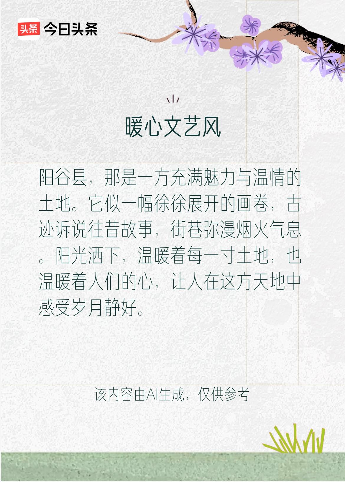 戳这里👉和我一起作诗词歌赋,赢万元大礼~在阳谷县的街头巷尾,每一块青石板都承载着历史的记忆。当微风轻拂,那古老的屋檐下,仿佛还回荡着过往行人的欢声笑语。走进幽深的小巷,转角处或许就能遇见一位正在写生的画家,他用手中的画笔,试图勾勒出这座小城独有的韵味。 而到了夜晚,夜市的灯火点亮了整个城市。小吃摊的香气四溢,烤串的滋滋声、摊主的叫卖声、食客们的谈笑声交织在一起,构成了一曲热闹的市井乐章。人们在这里大快朵颐,享受着这份简单而纯粹的快乐。 此刻,我们诚邀你加入这场文学创作大会。在这充满诗意与生活气息的阳谷县中寻找灵感,用诗词歌赋描绘出它的美。万元大礼正在等着才华横溢的你,别再犹豫,戳这里👉和我一起尽情挥洒笔墨,创造属于我们的文学盛宴!