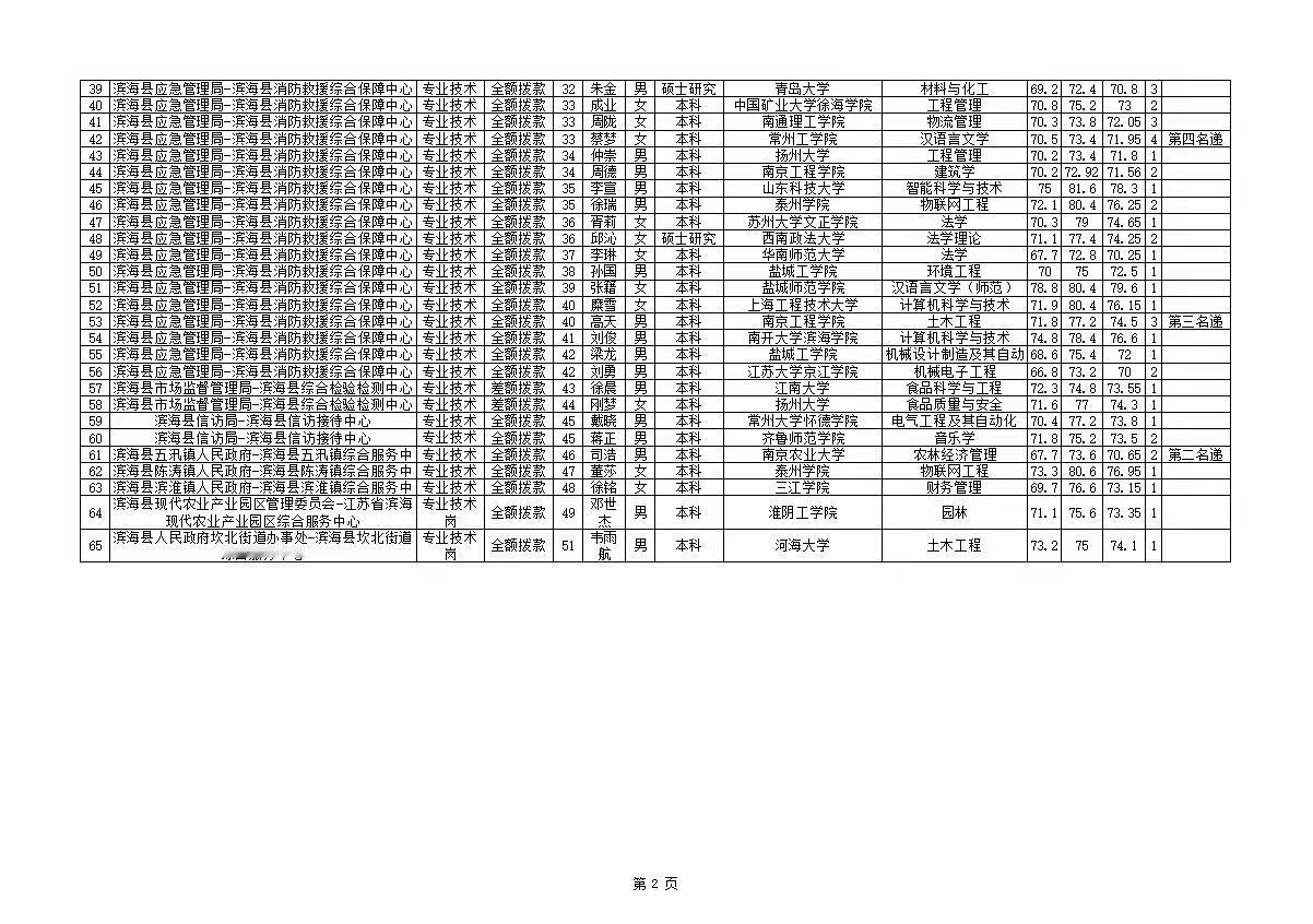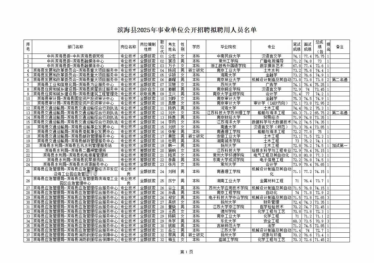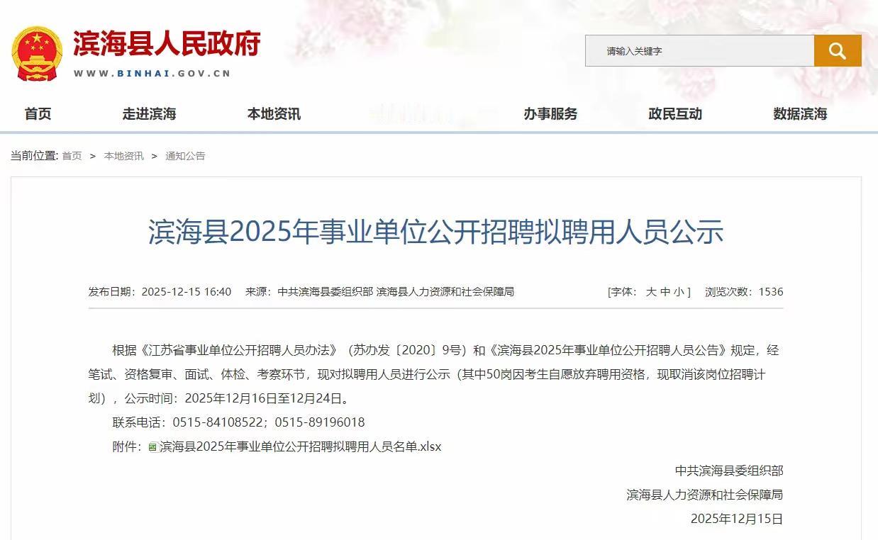 江苏盐城:滨海县发布2025年事业单位公开招聘拟聘用人员公示,涉及65人!涉及应急管理局、县委党校、交通运输局等多部门岗位,拟聘用人员涵盖材料化工、汉语言文学、会计学等专业,毕业院校包括清华大学、南京大学、巴斯大学等,其中50岗因考生自愿放弃被取消招聘计划