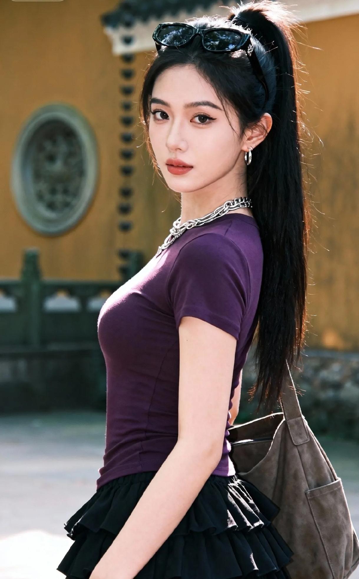 都市少女风穿搭,紫色上衣+黑色百褶裙,时尚又优雅! 紫色裙子穿搭 紫色t恤套装裙