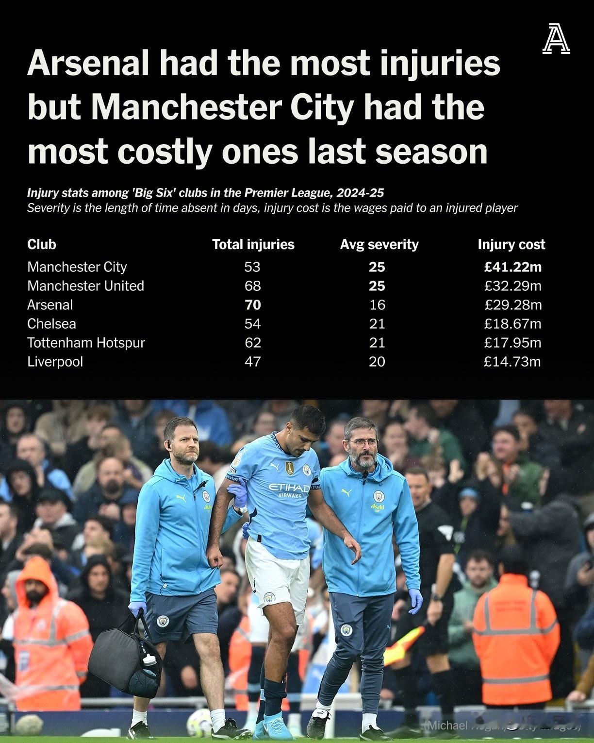 过去五年,英超俱乐部的伤病问题已导致薪资损失超过10亿英镑。 数据分别是: - 曼城:53人次,25天,4122万英镑 - 曼联:68人次,25天,3229万英镑 - 阿森纳:70人次,16天,2928万英镑 - 切尔西:54人次,21天,1867万英镑 - 热刺:62人次,21天,1795万英镑 - 利物浦:47人次,20天,1473万英镑 ■ 阿森纳伤病最多,但曼城上赛季的伤病成本最高 ■ 英超伤病成本高于其他欧洲主要联赛 ■ 过去五年中,Big 6豪门里伤病最多的球队均未赢得联赛冠军