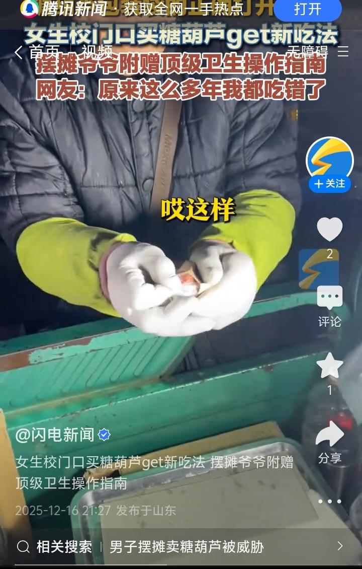 青岛校门口糖葫芦爷爷爆火!女生随手一拍竟揭街头小吃终极卫生密码,全网泪目:这堂课比糖还甜! (來源:閃電新聞) 那个冬日的傍晚,青岛某中学门口飘着熟悉的甜香。一个女生举着手机,记录下买糖葫芦的寻常瞬间,却意外拍下让三百万人沉默的一幕。头发花白的摆摊爷爷没有急着收钱,而是用那双布满老茧的手,轻轻捏住糖葫芦的包装纸边缘。 “闺女,这样撕。”爷爷的声音混着风声,他示范着将包装纸从上往下卷成小筒,冰糖葫芦的竹签顺势穿过纸筒底部。整个动作行云流水,山楂不沾手,糖霜不黏指。女生愣住了,评论区更炸了锅:“吃了二十年,今天才知道包装纸不是用来拽的!”“爷爷手里卷的不是纸,是失传的匠心。” 这哪里只是吃法?这是一位街头匠人最后的坚持。在流量为王的时代,我们习惯了扫码即走,习惯了塑料包装一扯了事。可这位爷爷,偏要在五块钱的生意里,塞进一份比冰糖更珍贵的“使用说明书”。他守护的,是食物与人之间那份最初的得体与尊重。 我们抱怨外卖脏,质疑小摊乱,却从未停下脚步听听他们的声音。爷爷每一个细致的动作,都在无声反驳着对街头小吃的傲慢偏见。他的摊子没有星级证书,但这卷纸的手法,胜过无数空洞的卫生标语。真正的干净,从来不在表面,而在那份将心比心的周到。 视频像一颗投入湖面的石子,涟漪荡进了无数人的童年记忆。多少人想起,小时候巷口那个总会多给一颗糖画的婆婆,学校旁那个永远把煎饼果子裹得严严实实的大叔。他们或许从未离开,只是我们奔跑得太快,忘了回头看看这些温暖的地标。 爷爷走红后,人们发现他的糖葫芦总是最亮最脆,他的摊位前永远收拾得清清爽爽。这不是表演,而是深入骨髓的习惯。在这个追求短平快的世界里,他固执地用慢动作,为我们上了一堂关于“职业尊严”的公开课。无论身处何种行业,敬畏手中的工作,便是最高级的体面。 女孩的镜头,照见了平凡里的光。我们为之感动的,是那套“顶级操作指南”背后,一份未被时代洪流冲淡的淳朴善意。他本可以不说,却选择多费一句口舌,多做一个动作。这点多余的用心,恰恰是这个社会最稀缺的奢侈品。 所以,下次当你接过一份街头小吃,不妨看看摊主的手。那可能是一双沾着油渍的手,一双冻得通红的手,但也可能是一双藏着故事、传递着温度的手。每一份微小的生计,都值得被认真对待;每一个认真的灵魂,都应当获得回响。 青岛的晚风依旧很冷,但糖葫芦爷爷的小摊前,暖意正在汇聚。这份温暖告诉我们:最深的人间烟火味,就藏在那份愿意为你多思考一步的温柔里。匕、人 糖葫芦老人