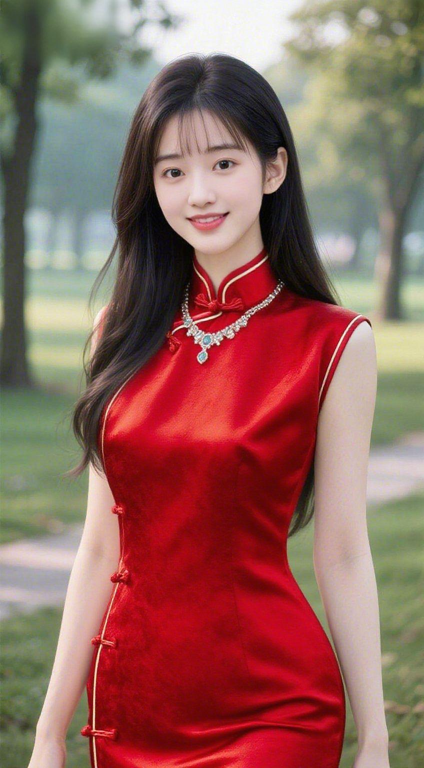 《红袍载满春日柔》 草坪的风裹着柳烟,轻落她肩头——正红旗袍像浸了晴霞,月白滚边沾着云的软,盘扣缀着细碎的光。 长发垂落时,衣料裹着春的舒展,像园里初绽的月季,带着晨露的润。脚下草色漫向裙摆,她抬眸笑时,旗袍褶皱里晃出光斑,把周遭的风都染得温软。 这哪里是一件衣裳?是檐角坠着的暖阳,是茶盏浮着的清甜,是日子里藏不住的明丽。风还轻漾,她转身时,红袍裹着的不是身形,是撞进眼底的、鲜活的春。 红袍春光 国风雅柔