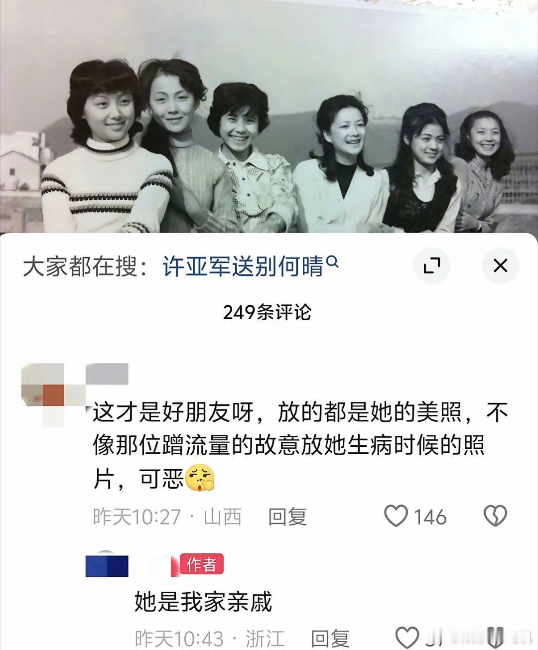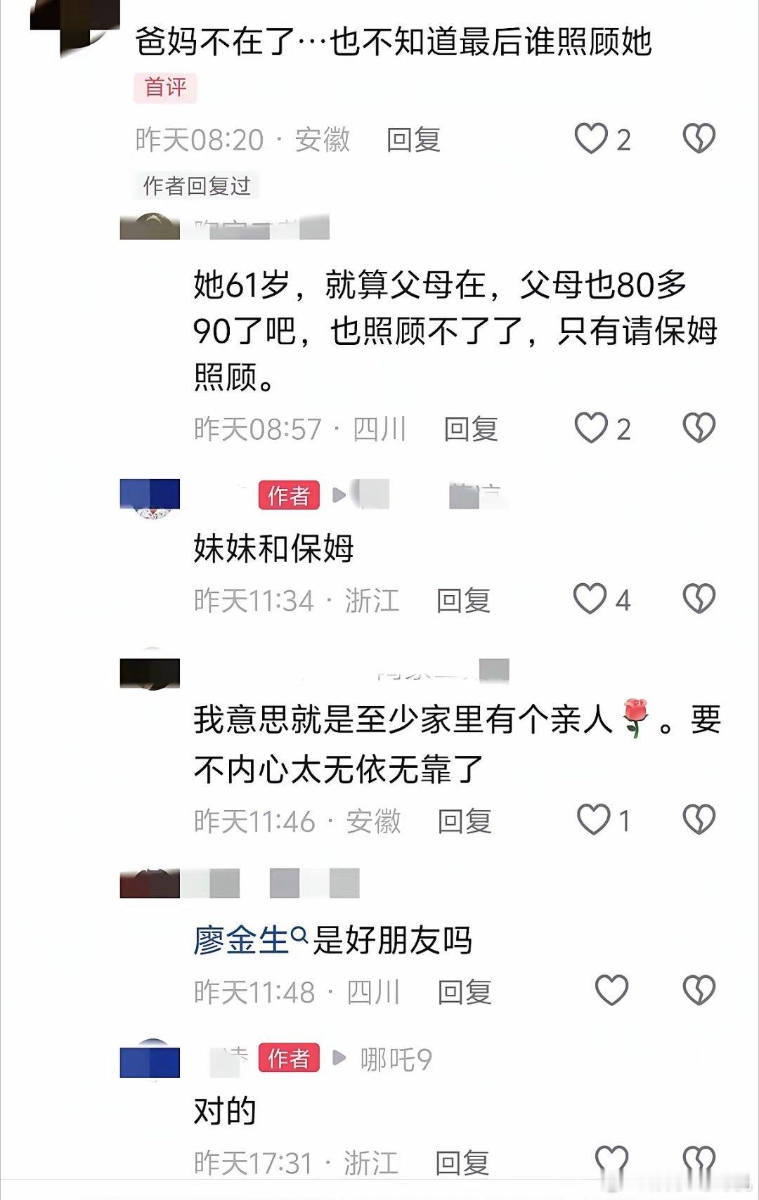 据何晴的亲戚透露,在何晴老师生病的日子里,照顾她日常起居最多的并不是廖京生,也不是王卫国,而是比她小4岁的妹妹和保姆。大家都知道,何晴老师和许亚军生了一个儿子许何,今年已经24岁了,跟着爸爸。而且许何有自己的演艺事业要忙碌,不可能一直陪着妈妈。何晴还有个妹妹,比她小4岁,所以照顾她日常生活的重任自然就落在了妹妹和保姆身上。王卫国和何晴是多年的邻居,住在一个院子里,生病的时候,也经常打电话求助他,让他将自己送到医院去。看了何晴的故事,突然意识到,一个人忙忙碌碌一辈子,什么都替别人考虑,但自己最需要帮助的时候,别人却不一定能及时的出现在身边。不要打算什么未来,活在当下,珍惜眼前人吧!