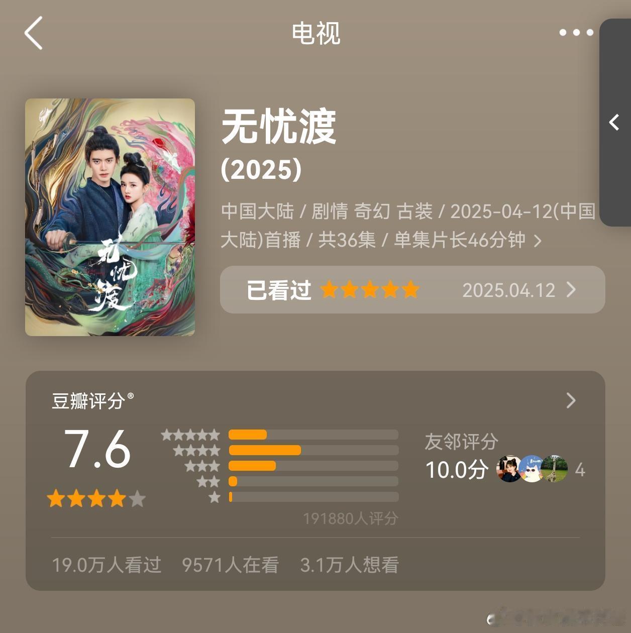 无忧渡豆瓣评分从7.4升到7.6分了。