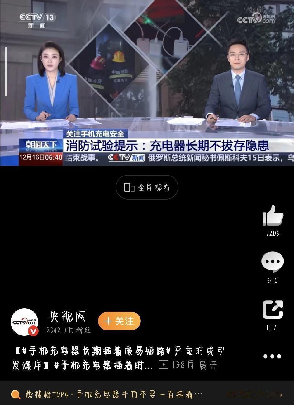 充电器不拔?你是不是也有这样的习惯:手机充满电后,充电器就一直插在插座上,觉得下次用着方便?可最近消防员提醒的一个安全知识点,让不少人惊出冷汗——这个小小的充电器,竟然是个“隐形安全隐患”,哪怕不充电,插着也在悄悄耗电,还可能引发危险。 其实充电器本质就是个变压器,简单说就是把家里插座的高压电,转换成手机能承受的低压电。消防员做过实验,用感应测电笔靠近插在插座上的空充电器,电笔立马绿灯亮起,这说明它一直在通电工作;再用热成像仪一看,充电器温度能达到27摄氏度以上,要是充电线有点破损,模拟短路情况,几分钟内温度就能冲到53摄氏度,还会持续升温。 别小看这持续的热量,它会慢慢加速充电器内部元件老化,就像让零件提前“退休”,时间久了很容易出现线路故障,引发短路。浙江温州就发生过这样的事,一间出租屋因为长时间没拔的手机充电器短路起火,幸好没人被困;广东佛山一户人家更惊险,床头插座上插着的充电器发生故障,直接引燃了床上的被褥,主卧被烧得一片狼藉。这些案例都在提醒我们,充电器长期不拔可不是小事。 除了安全隐患,它还在悄悄“偷电”。可能有人觉得,不充电能耗多少电?可别小瞧这一点点。国家标准显示,一个手机充电器的待机功率大概在0.5到1瓦,看似微不足道,一年下来也能耗掉4到8度电。要是家里有三四个充电器都这么插着,再加上路由器、机顶盒这些常年待机的设备,一年浪费的电费都能买不少东西了,实在不划算。 还有些人喜欢把插着电的充电器放床头、沙发上,或者和被褥、窗帘这些可燃物放在一起,这更是把风险拉满了。消防员特别强调,劣质充电器的风险更高,那些十几块钱的杂牌货,阻燃性差、接口容易生锈,短路起火的概率比原装充电器高很多。 其实避免风险的方法特别简单:充完电后顺手拔掉充电器,或者关掉插座开关;出门尤其是长时间离家时,一定要检查一下,把没用的充电器都拔下来;尽量用原装或正规品牌的充电器,别图便宜买劣质产品。 生活里的安全往往藏在这些小细节里,一个简单的拔插头动作,就能既省电又消除火灾隐患。别再为了一时方便忽视这个“隐形杀手”,从今天起,养成充完电拔充电器的习惯,给家人和自己一个更安全的生活环境。 来源:央视网