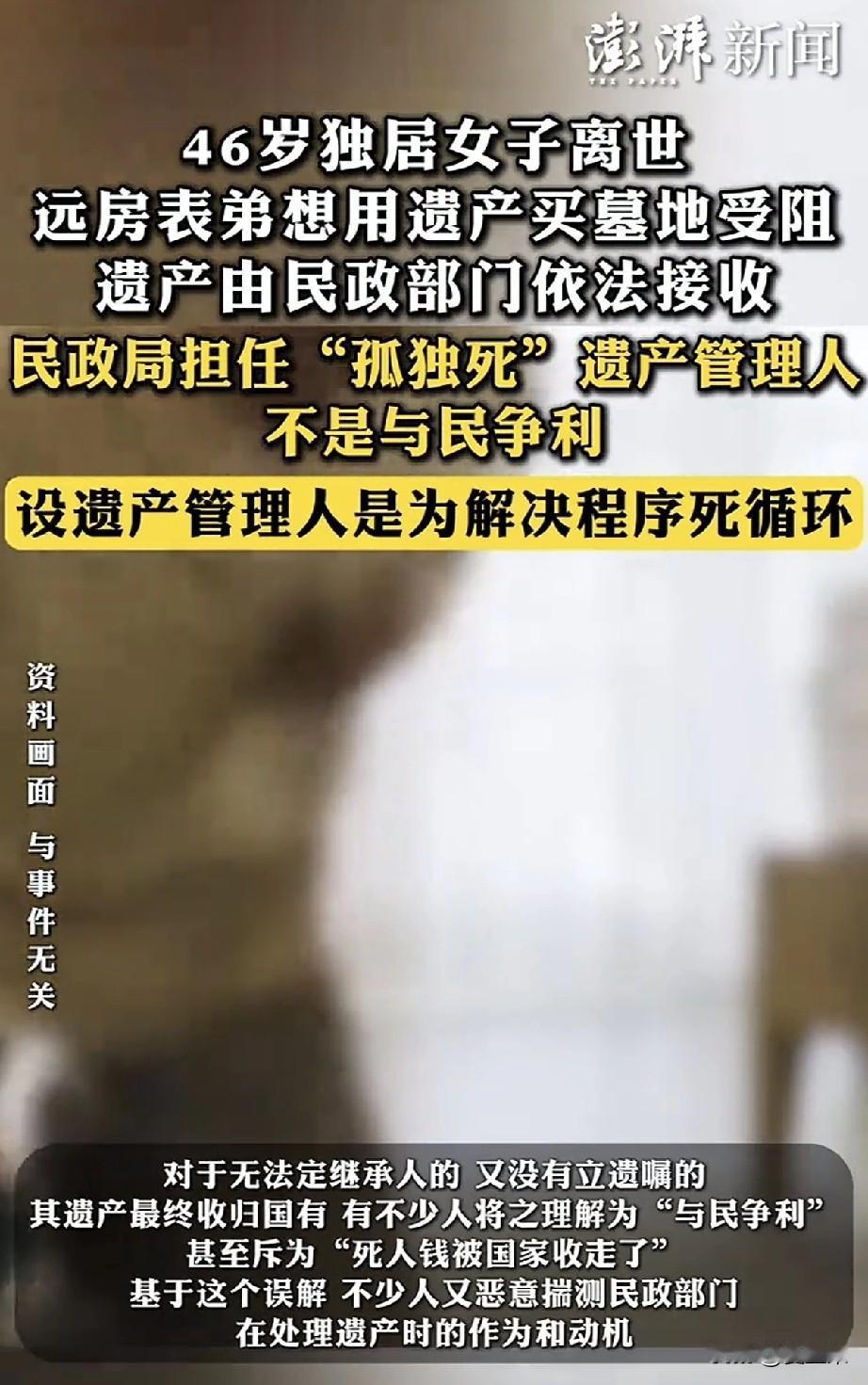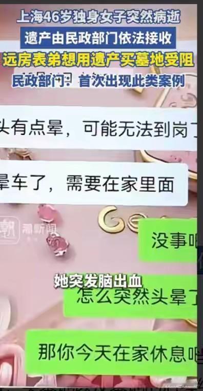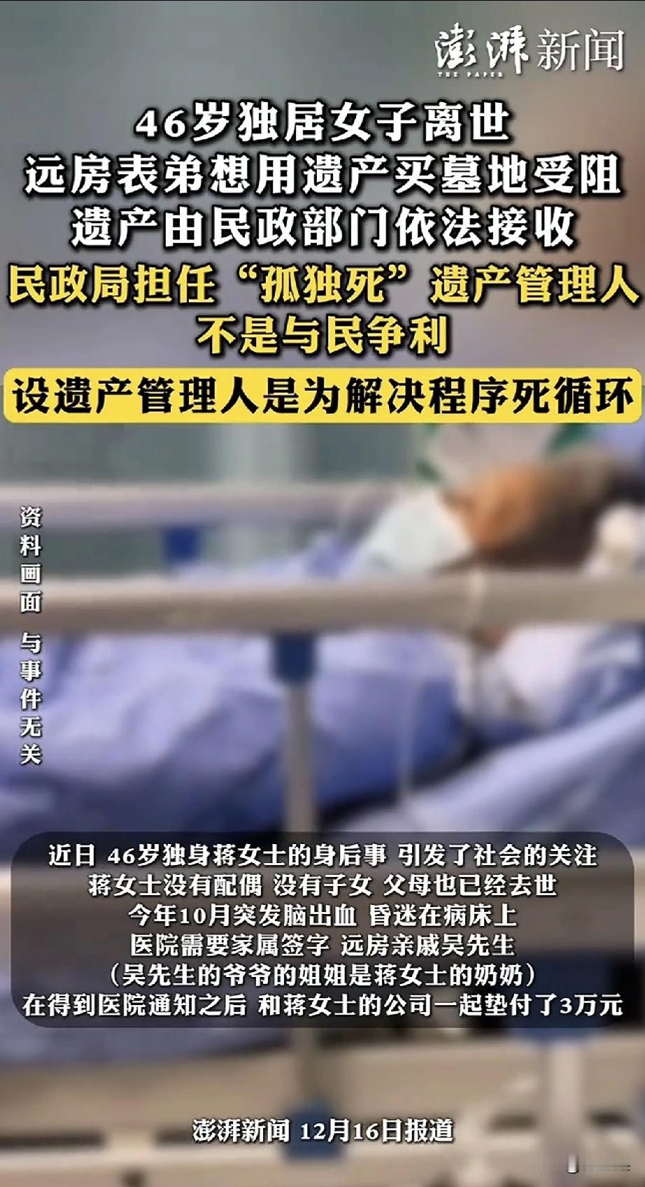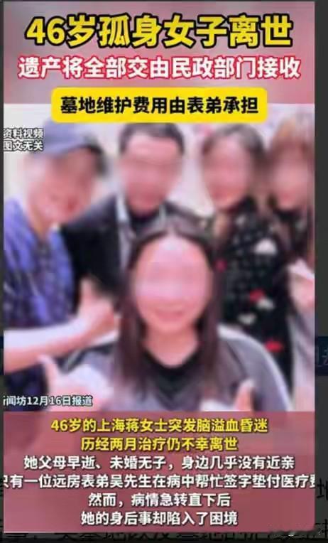 上海46岁的蒋女士去世了, 她的标签是未婚未育,父母早逝,身边没有一个亲人。 她就是一个独身的典型, 10月份突发疾病被同事送医救治, 当时就面临尴尬:需要医药费,蒋女士有医保也有积蓄,却没有一个人能合法使用。 当时网络热议这该怎么办, 毕竟挽救生命是第一要位的, 后来找到她一个远房的表弟,表弟也无权使用她的财产, 没办法,社区通过法律途径,暂时接管了,让蒋女士顺利救治, 可是最终挺了两个多月,她还是去世了。 这事儿就很难办, 如果蒋女士治好出院了,就没有现在很尴尬的局面。 现在她死了,不能葬墓地,所有财产充公,归社区所有。 远房表弟情愿给她选一个墓地,社区都不同意,说顶多海葬。 还敢不婚不育吗? 想起鲁山那个跳楼的女老师,在跳楼选择死亡的那一刻,她赢了, 而蒋女士的经历,她输了。