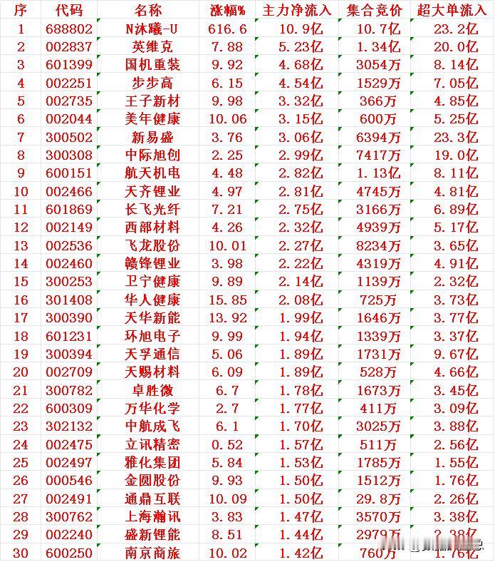 12月17日开盘45分钟,主力资金“买入的 ”的30名单一览! N沐曦-U:净流入10.9亿元 英维克:净流入5.23亿元 国机重装:净流入4.68亿元 步步高:净流入4.54亿元 王子新材:净流入3.32亿元