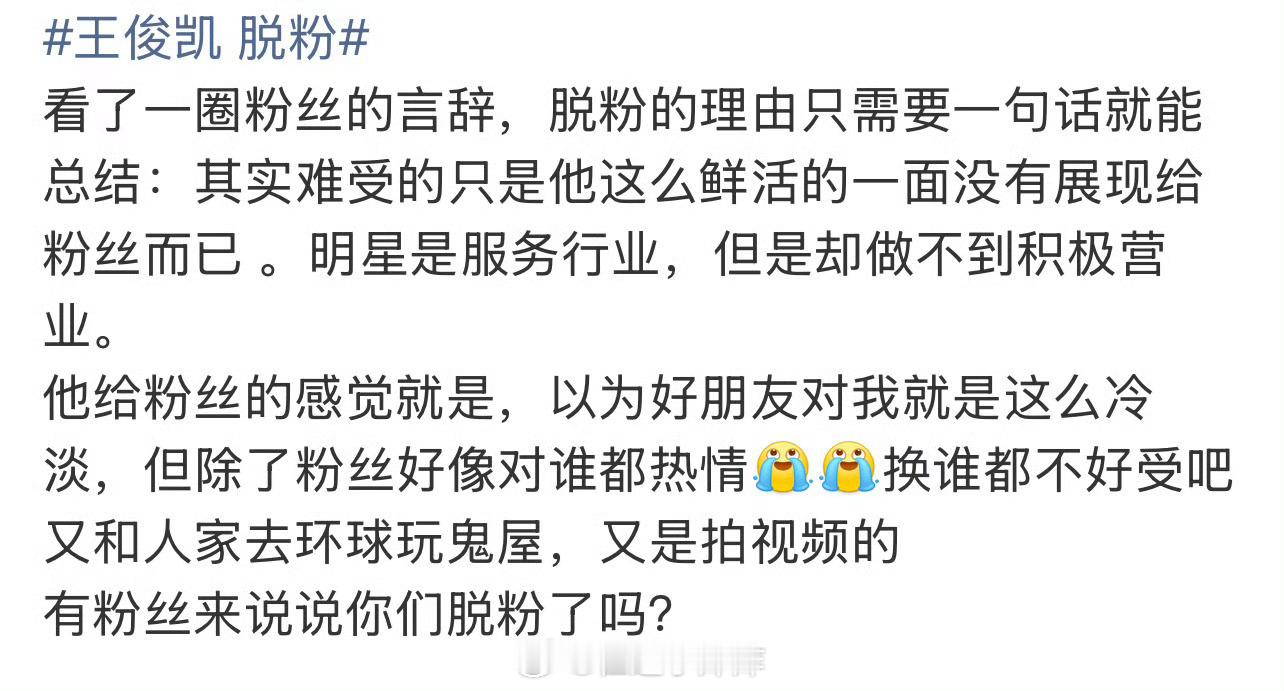 养成系粉丝总有一种无痛当妈的感觉孩子的爱好要鼓励孩子的事业要支持有人说孩子的不好,冲上去就跟人干架很想把孩子的一生都稳稳捏在手里的既视感但是,孩子都会长大的哪怕是亲生儿子,父母也要接受他是自由的个体啊什么样的父母,会在孩子和新朋友打成一片的时候,嫌弃孩子跟自己不亲了呢,真有一颗父母心的话,看到孩子的朋友那么优秀,孩子又那么开心,应该替他们开心不是吗一些没用的占有欲,还是省省吧王俊凯给粉丝的感觉