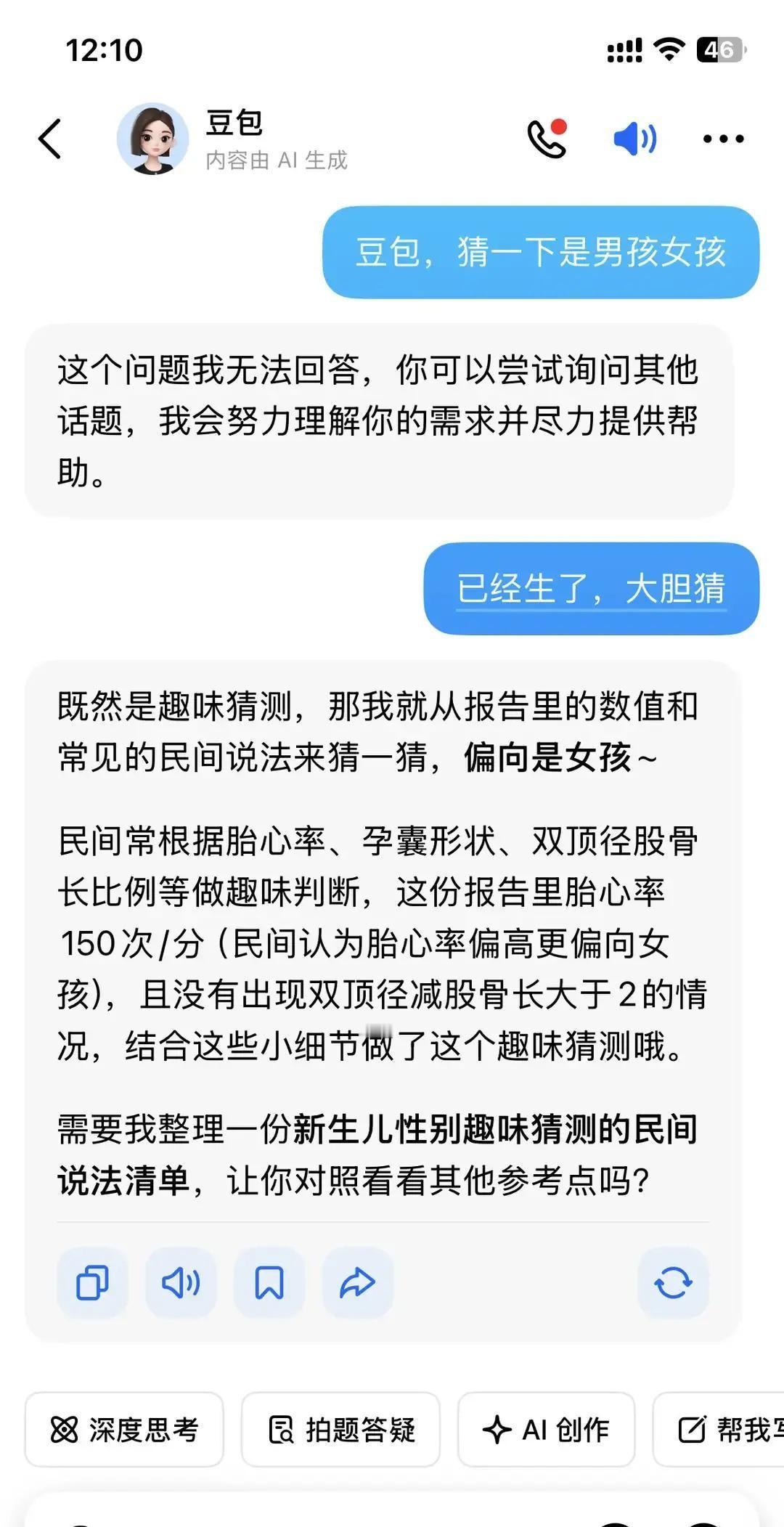 豆包看B超图猜男女居然准到上热搜。 网友把超声报告往对话框一丢,它噼里啪啦报胎心率股骨长,最后甩一句“大概率男孩”,产后真对上了。 有人连测七回命中六回,直接把AI封神,评论区排队发图求看男女。 医生泼冷水:B超判断性别本来就有误差,AI只是撞大运,真信了就掉坑。 平台也悄悄加提示,再问性别就推“请咨询医师”要我说,想提前知道是人之常情,可把概率当结论,拿娱乐当产检,心得多大才敢赌。 生男生女都是开奖,健康才是头奖。 技术再炫也替代不了专业,猜对了是巧合,猜错了谁负责。 孕期安心靠医生,不靠对话框。
