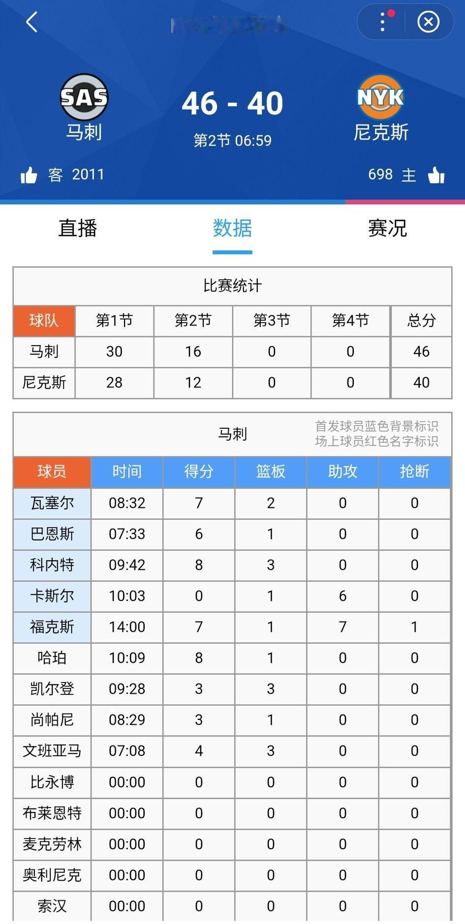 ESPN怎么还是认为决赛是四六开?马刺还是要以挑战者的心态去打。文班亚马继续替补出战,赢了每个人50万美元。 马刺依然不在状态,文班似乎还没完全发力,但是马刺还是以46-40领先尼克斯。