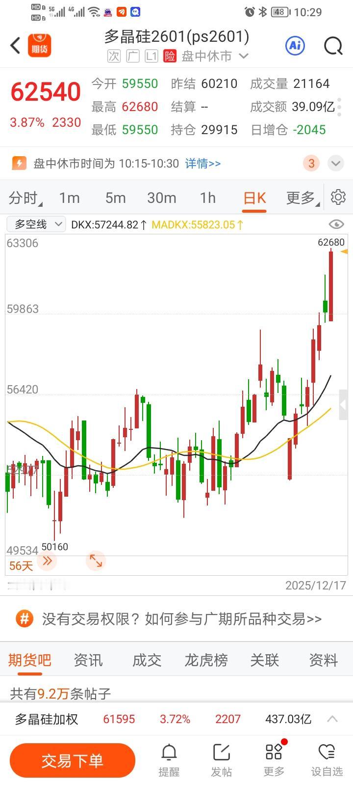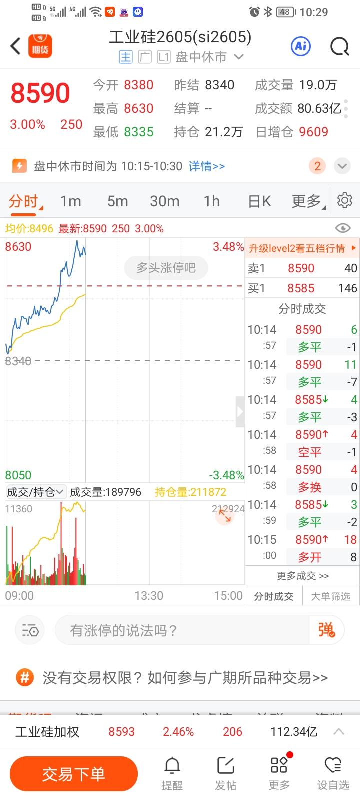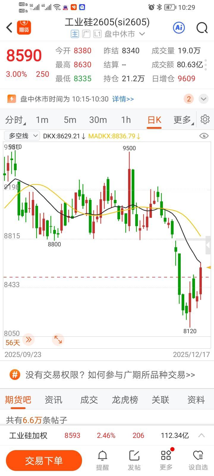 不信邪,终于开始赢利了。 前几天被我发现一个bug,多晶硅一直在涨,工业硅却反方向下跌,我判断这种怪异的走势不可能一直下去,便做多工业硅。 经过几天不断下跌,我不断补仓,今天终于反转,上午工业硅大涨3%,帐户有了盈利。 我想继续持仓,等工业硅补涨到多晶硅的涨幅再平仓,吃一次大肉,应该没问题吧。