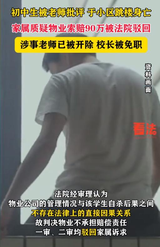 陕西西安,一个初中生在学校被老师批评了一顿,回到小区,他直奔27楼,一声不吭地一跃而下,离世了,这害苦了老师,校长和物业,因为这件事,老师被开除了,校长被免职了,物业被起诉索赔90万。 “要不是有那几块儿砖,孩子根本就爬不上去!所以你们也有责任!”小军家属在法庭上的控诉让许多人都为之一愣,也让人们对“责任”有了更深的思考。 事情的起因很简单,仅仅是老师的几句批评,对于绝大多数孩子来说,或许只是成长中的一次小小波折,甚至可能转身就忘了。但小军的反应却是极端的,回到家后,他并没有向家人求助,也没有寻找朋友倾诉,而是选择了一条无法回头的路。 事发后,小军的家属表示学校要承担主要的责任,他们认为是老师的批评让孩子承受过大的精神压力,这才导致了悲剧的发生。虽然学校在事件发生后迅速处理了涉事老师,并且还进行了赔偿,但这并不能安抚家属悲痛的情绪。 而令许多人都没想到的是,之后物业公司也被推到了风口浪尖,家属认为,物业公司也应该为孩子的死亡承担一定责任。 根据家属的说法,小区楼道内有一些砖头没有及时清理,这些砖头恰好被孩子用来攀爬楼顶的围墙。此外,楼道没有监控,孩子的举动没有被及时察觉;更糟糕的是,楼道窗户附近也没有任何安全警示标志。于是家属直接将物业告上了法庭,要求赔偿。 然而,法院的判决却给了家属当头一棒。 一审法院认为,虽然物业管理上存在疏漏,但这些问题与孩子的死亡并没有法律上的因果关系,因此法院驳回了家属的诉求。而家属的内心不愿接受这个结果,所以他们决定上诉,但二审法院依然维持了原判,最终判定物业公司无需承担责任。 法院认为,孩子的自杀行为是由多方面原因造成的,而且小军已经年满12岁,有着自己的思想和认知,单纯归咎于物业管理的不足,显然不符合逻辑。 其实说实在话,现在许多孩子的情感都比较敏感,任何小小的刺激,都可能成为他们无法承受的沉重负担。所以无论是学校还是家长,甚至是社会,都有责任对孩子们的成长环境负责。 学校需要更多关注孩子的心理健康,而不仅仅是成绩和纪律;家庭也应当成为孩子情感的港湾,而不是单纯的监控者;社会则需要在各个方面为孩子们提供一个更加安全、宽松的成长环境,避免让孩子在无助和孤独中做出极端决定。 这场悲剧,或许应该成为我们每个人心里的一段深刻记忆,提醒我们不再忽视任何一个孩子的需求。 信息来源: 极光新闻丨西安一初中生被老师批评后从小区跳楼身亡,家属状告物业公司 文丨小王 编辑丨史叔
