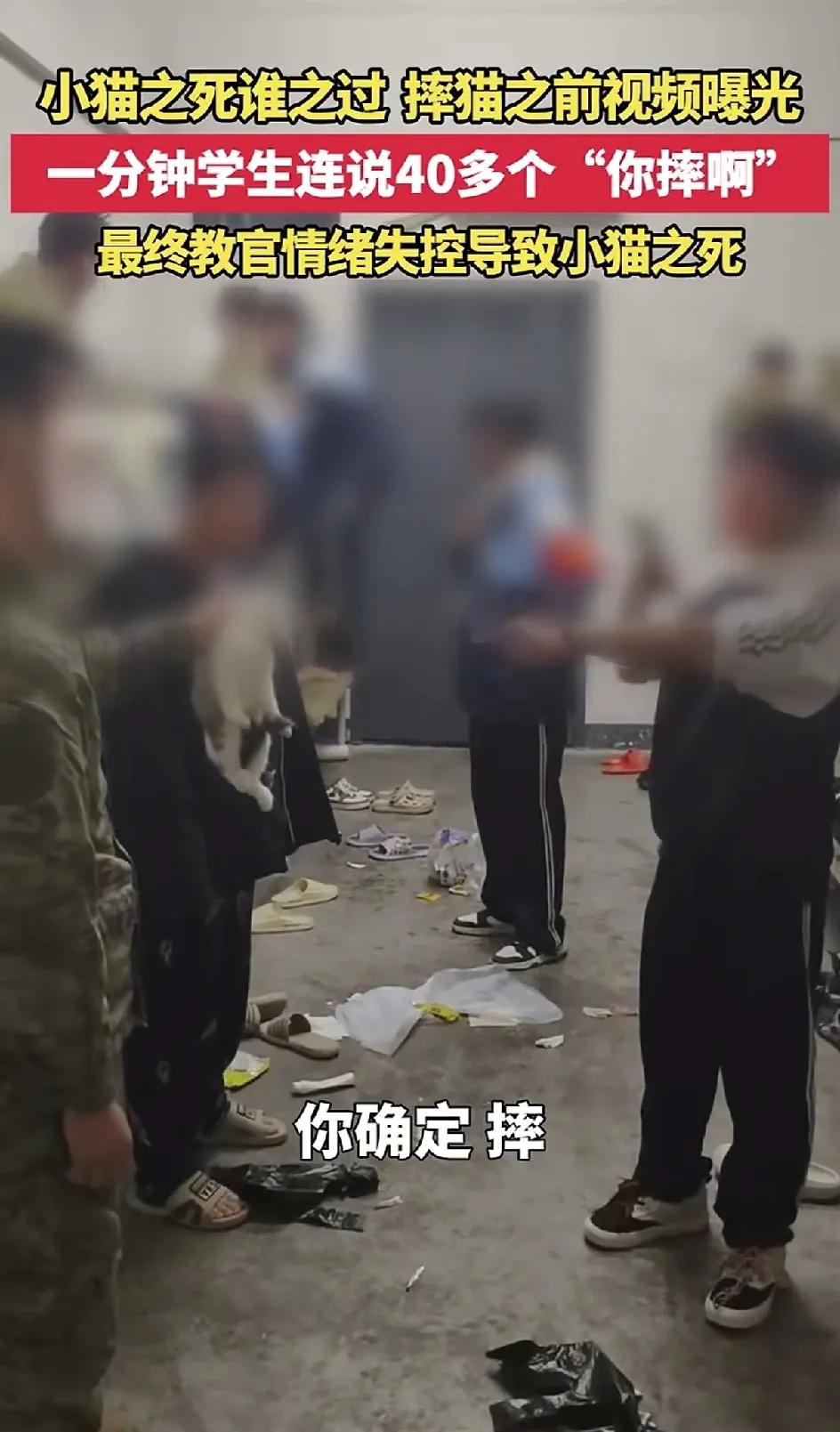 小猫之死谁之过?摔猫之前视频曝光。学生也是个犟种,故意激怒教官,一连说了40多个,你摔啊。老师太憨厚了,情商太低,不懂得给教官和学生调解。一点台阶都没有。 教官也很犟,学生让他摔他就摔。整个事件最无辜的就是小小猫,三个成年人没有一点智慧。