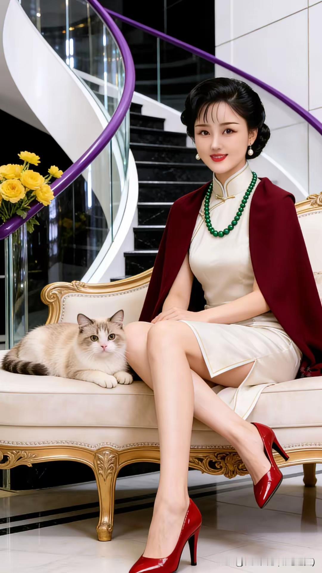 优雅红衣美人与猫咪的温馨时光🌸🐱