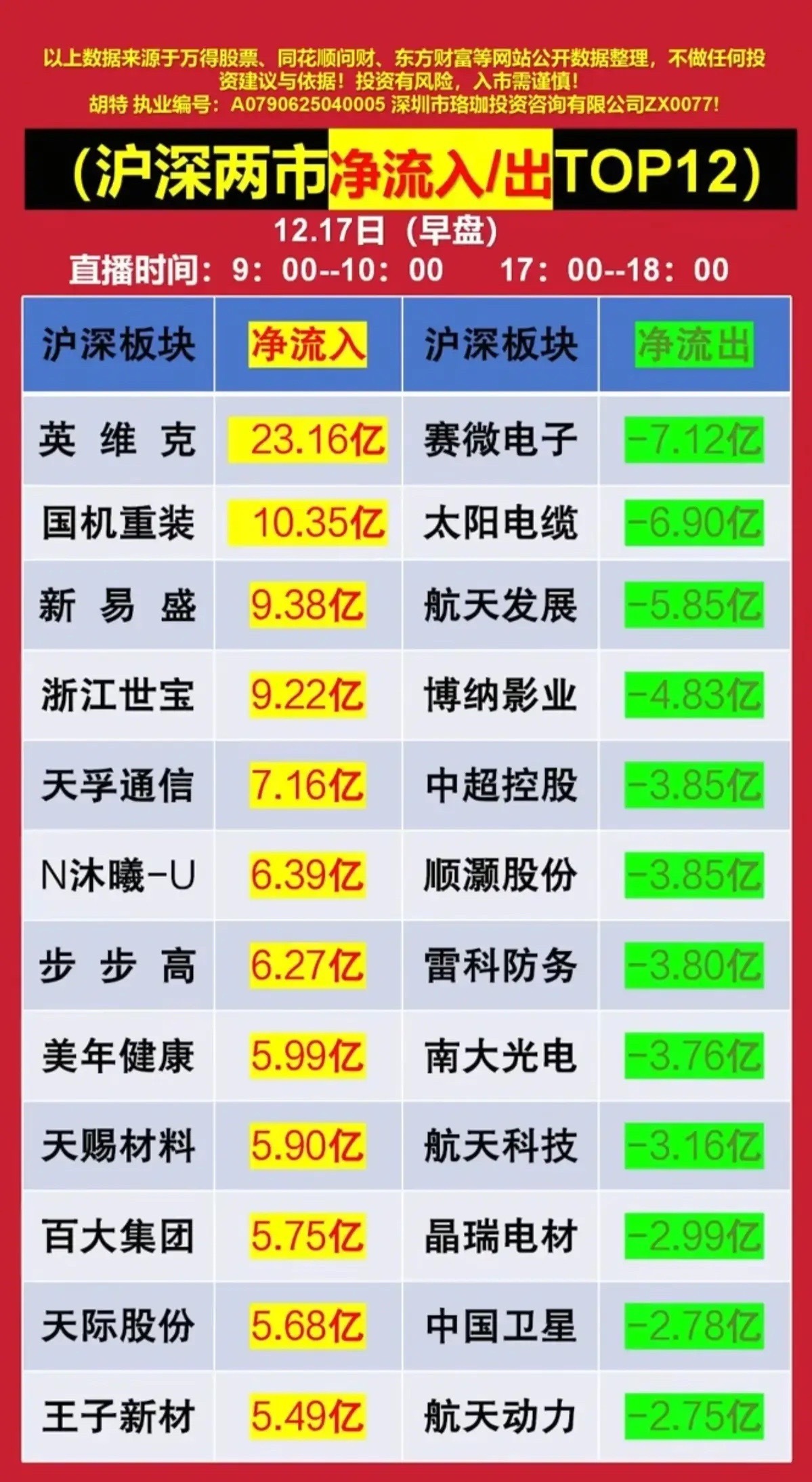 12月17日早盘沪深资金流向梳理分析一、整体资金流向特征12月17日早盘沪深两市资金流向分化显著,净流入端集中在科技硬件、装备制造、消费等领域,头部个股获资金大额扎堆,英维克以23.16亿净流入居首,资金虹吸效应突出;净流出端则聚焦半导体、军工、影视板块,赛微电子净流出7.12亿为最多,军工类个股成资金撤离核心标的,反映市场资金向细分景气赛道抱团,同时对高波动题材股进行抛售。二、个股逐一分析净流入个股1. 英维克:获23.16亿净流入居首,主营精密温控设备,受益于算力、数据中心产业高景气,早盘资金抢筹明显,温控设备需求随AI算力建设提升,成为资金布局核心标的之一。2. 国机重装:净流入10.35亿,主营重型装备制造,涉及核电、风电装备领域,政策推动高端装备国产化,叠加基建相关预期,吸引资金进场布局。3. 新易盛:净流入9.38亿,主营光模块产品,是光通信核心标的,全球算力网络建设带动光模块需求,行业景气度下资金对其关注度提升。4. 浙江世宝:净流入9.22亿,主营汽车转向系统,受益于汽车智能化、新能源汽车产业链发展,汽配板块局部行情下获资金短期追捧。5. 天孚通信:净流入7.16亿,主营光通信器件,卡位光模块上游核心环节,算力基建带动光器件需求,资金看好其产业链地位进行布局。6. N沐曦-U:净流入6.39亿,为上市新股,主营GPU芯片设计,聚焦AI算力芯片领域,新股上市叠加AI芯片赛道热度,吸引资金博弈。7. 步步高:净流入6.27亿,主营零售业务,消费复苏预期下,线下零售板块获资金短期关注,叠加商超零售板块轮动,成为资金流入标的。8. 美年健康:净流入5.99亿,主营健康体检服务,消费医疗板块估值修复预期,叠加年底体检需求旺季,资金对其进行布局。9. 天赐材料:净流入5.90亿,主营锂电池电解液,新能源电池产业链上游核心标的,电池企业补库预期下,电解液需求回暖吸引资金。10. 百大集团:净流入5.75亿,主营商贸零售、酒店服务,消费板块轮动下,线下消费场景复苏预期,带动资金短期流入。11. 天际股份:净流入5.68亿,主营小家电、六氟磷酸锂,新能源电解液材料+消费电子双赛道,六氟磷酸锂价格企稳后获资金关注。12. 王子新材:净流入5.49亿,主营包装制品、新能源零部件,切入新能源电池包装领域,新能源产业链细分环节的景气度吸引资金布局。净流出个股1. 赛微电子:净流出7.12亿居首,主营MEMS芯片制造,半导体板块前期涨幅后出现资金获利了结,叠加行业景气度分歧,成为资金撤离主要标的。2. 太阳电缆:净流出6.90亿,主营电线电缆制造,基建相关板块轮动后资金获利出逃,叠加线缆行业竞争加剧预期,引发资金抛售。3. 航天发展:净流出5.85亿,主营军工电子、信息安全,军工板块短期获利盘兑现,资金对军工题材的炒作情绪降温,引发撤离。4. 博纳影业:净流出4.83亿,主营影视制作发行,影视板块短期热度消退,票房不及预期等因素影响,资金对影视股进行抛售。5. 中超控股:净流出3.85亿,主营电线电缆、新能源线缆,线缆板块整体资金流出,叠加公司业绩表现平淡,引发资金撤离。6. 顺灏股份:净流出3.85亿,主营包装印刷、工业大麻,题材炒作退潮后,资金对工业大麻概念的关注度下降,出现大额流出。7. 雷科防务:净流出3.80亿,主营军工电子、雷达系统,军工板块整体资金撤离,公司军工业务订单落地节奏存疑,加剧资金流出。8. 南大光电:净流出3.76亿,主营电子特气、光刻胶,半导体材料板块前期炒作后,资金获利了结,行业技术突破进度不及预期引发抛售。9. 航天科技:净流出3.16亿,主营航天仪器、汽车电子,军工+汽车电子双赛道均出现资金分流,军工板块整体走弱带动其资金流出。10. 晶瑞电材:净流出2.99亿,主营光刻胶、电子化学品,半导体材料板块资金集体撤离,光刻胶国产化进度不及预期,引发资金抛售。11. 中国卫星:净流出2.78亿,主营卫星研制与应用,卫星导航板块短期炒作后热度降温,资金对航天军工题材的配置意愿下降。12. 航天动力:净流出2.75亿,主营航天发动机、泵阀产品,军工板块资金持续撤离,公司业绩增长乏力,进一步加剧资金流出。三、总结12月17日早盘资金流向体现出*强赛道抱团、弱题材撤离”的特征:资金向算力基建、高端装备、消费复苏等景气赛道的核心标的集中,而半导体、军工、影视等前期炒作或景气度存疑的板块,成为资金抛售重点。这种分化反映市场当前风险偏好偏低,资金更倾向于业绩确定性强、有产业政策支撑的细分领域,题材股则面临资金持续流出的压力。本文涉及资讯、数据等内容来自网络公共信息,仅供参考,不构成投资建议!